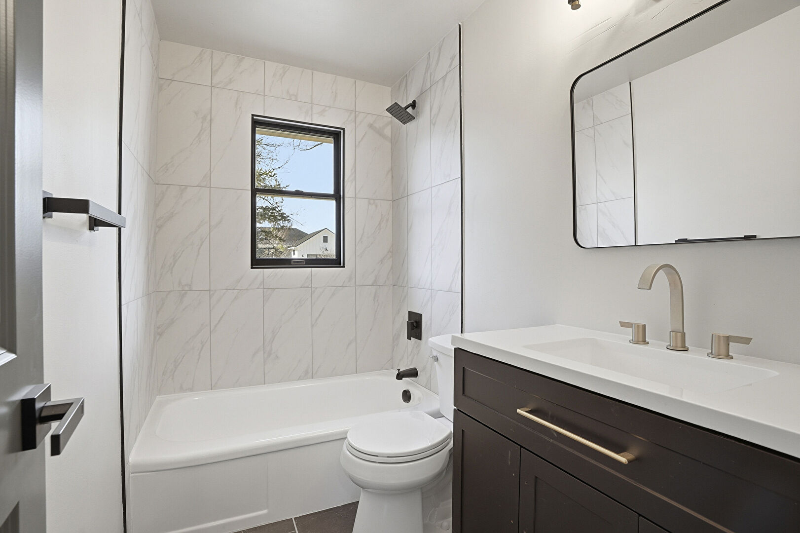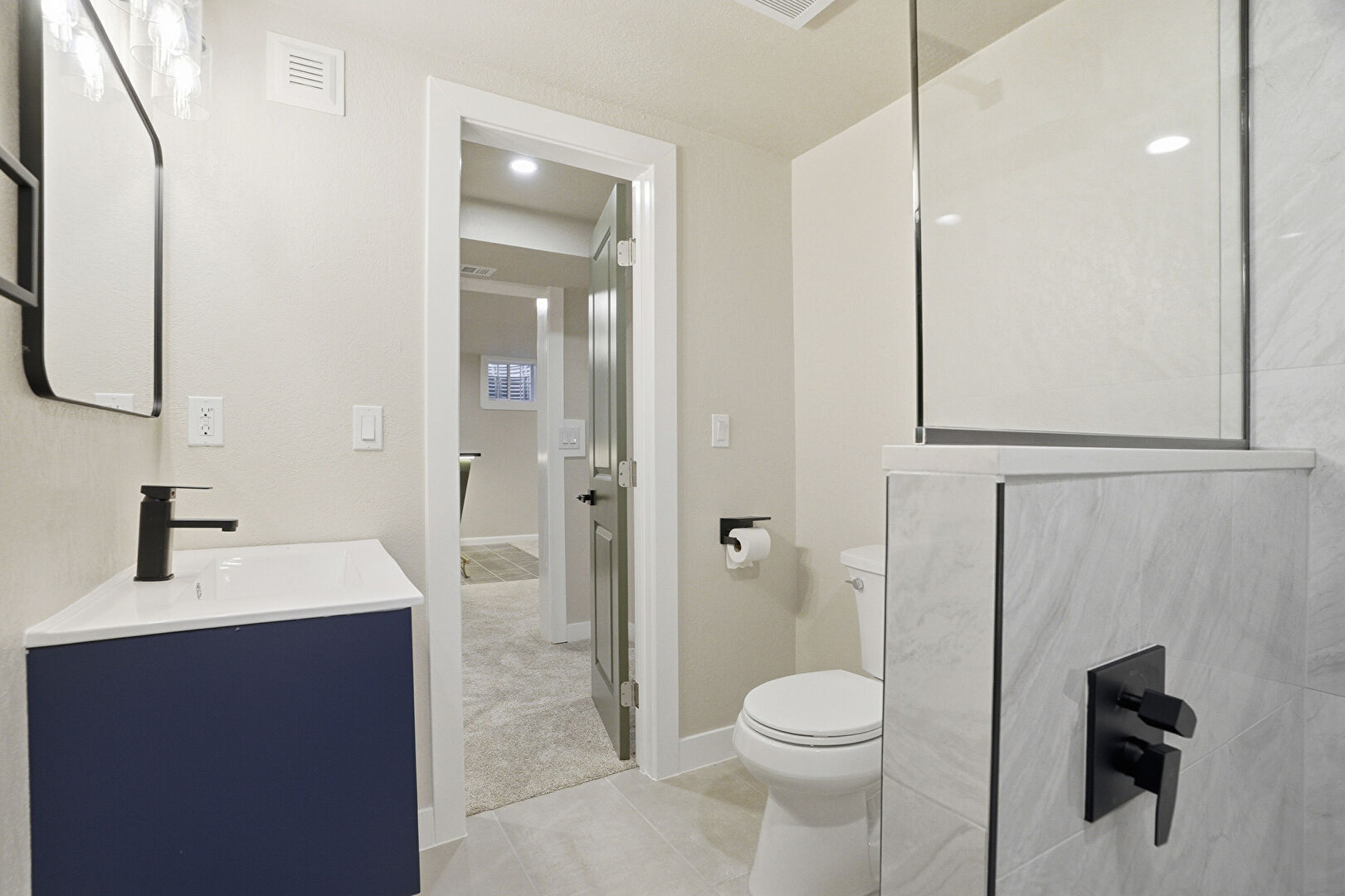 Carpet, Combined Bath Shower, Drywall, Full Bathroom, Natural Light, Recessed Lighting, Tile Floor, Vanity, Vent, Baseboards Wall, Tile Floor, Vanity