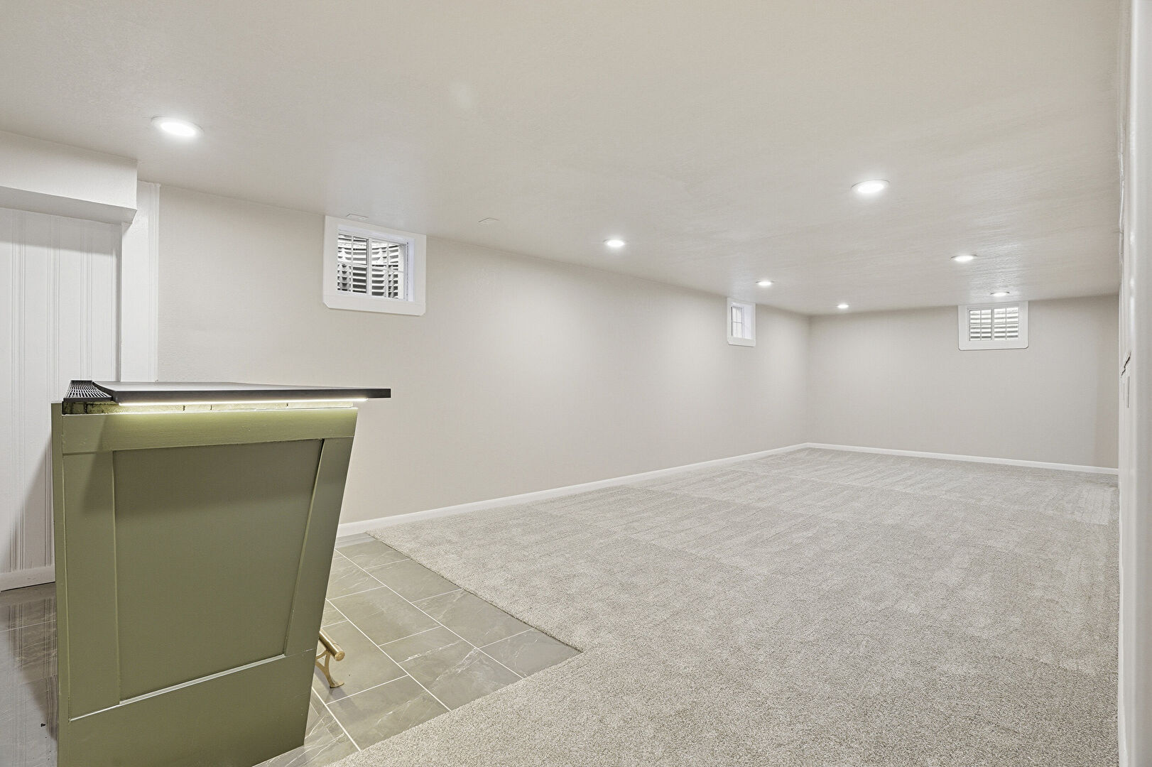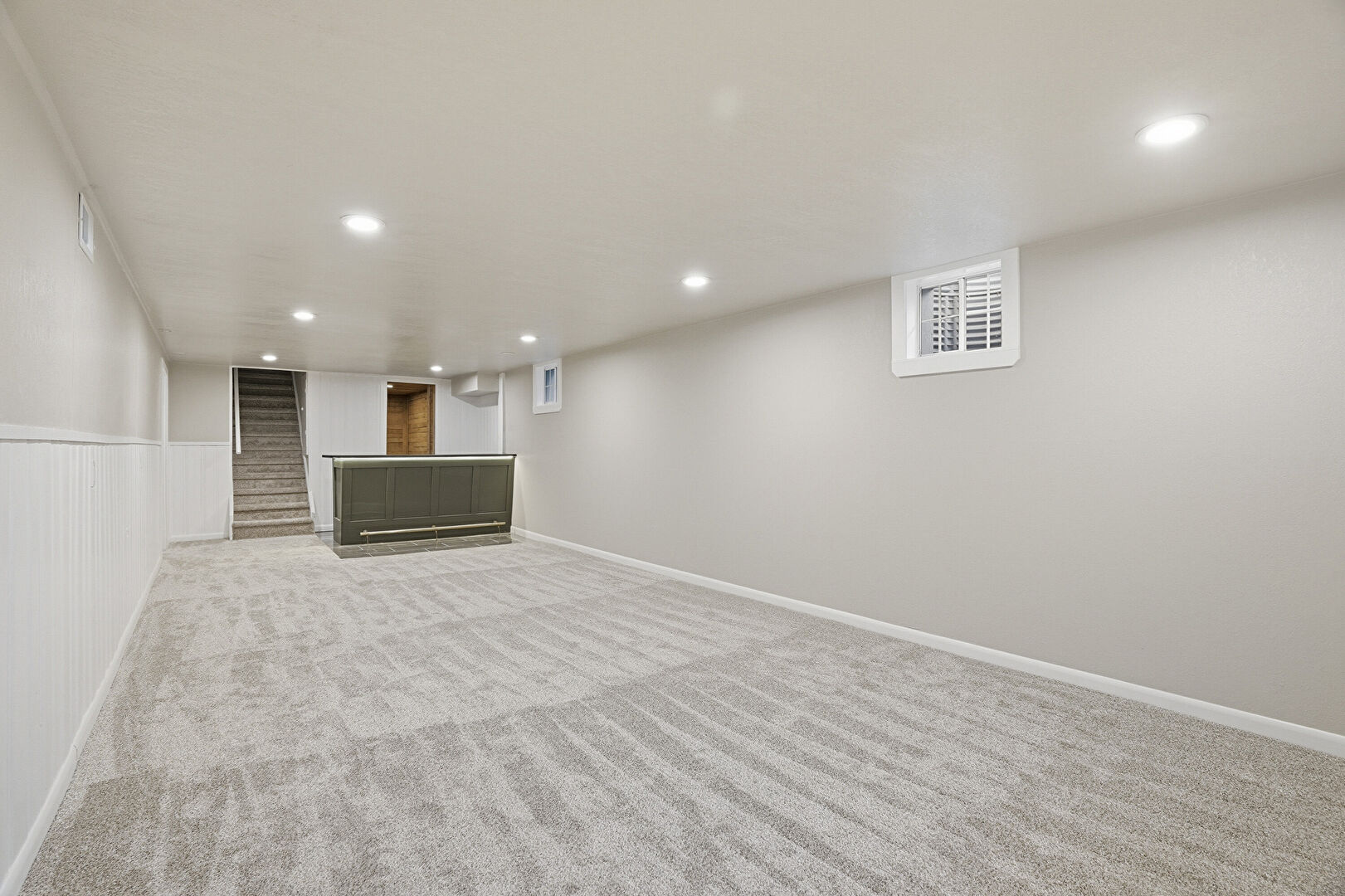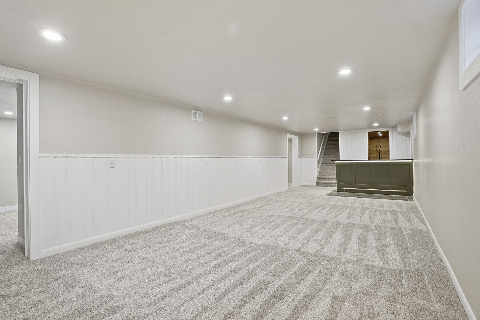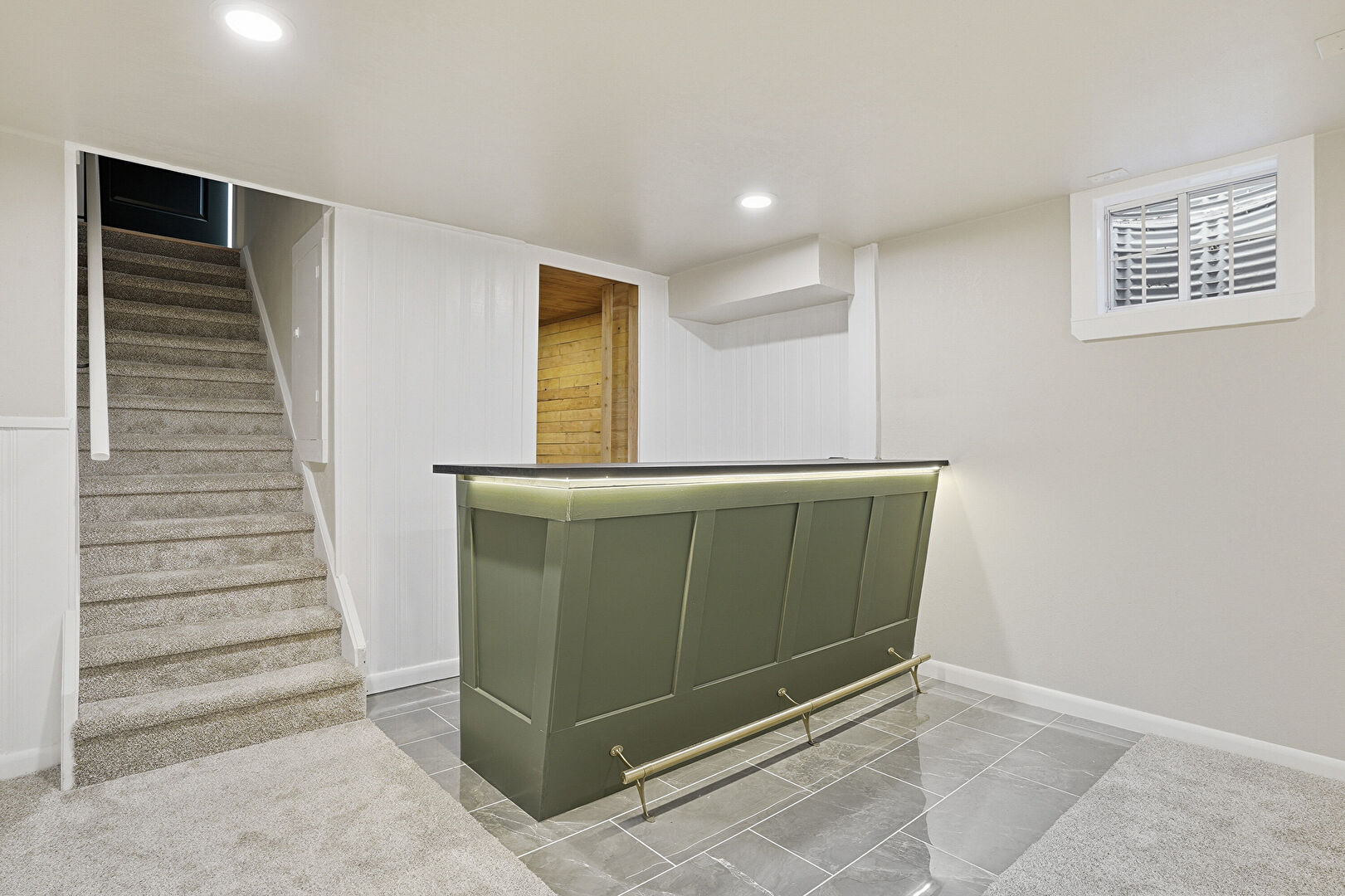 Baseboards Wall, Basement, Carpet, Drywall, Green Cabinets, Indoor Bar, Recessed Lighting, Stairs, Tile Floor, Baseboards Wall, Wood Wall
