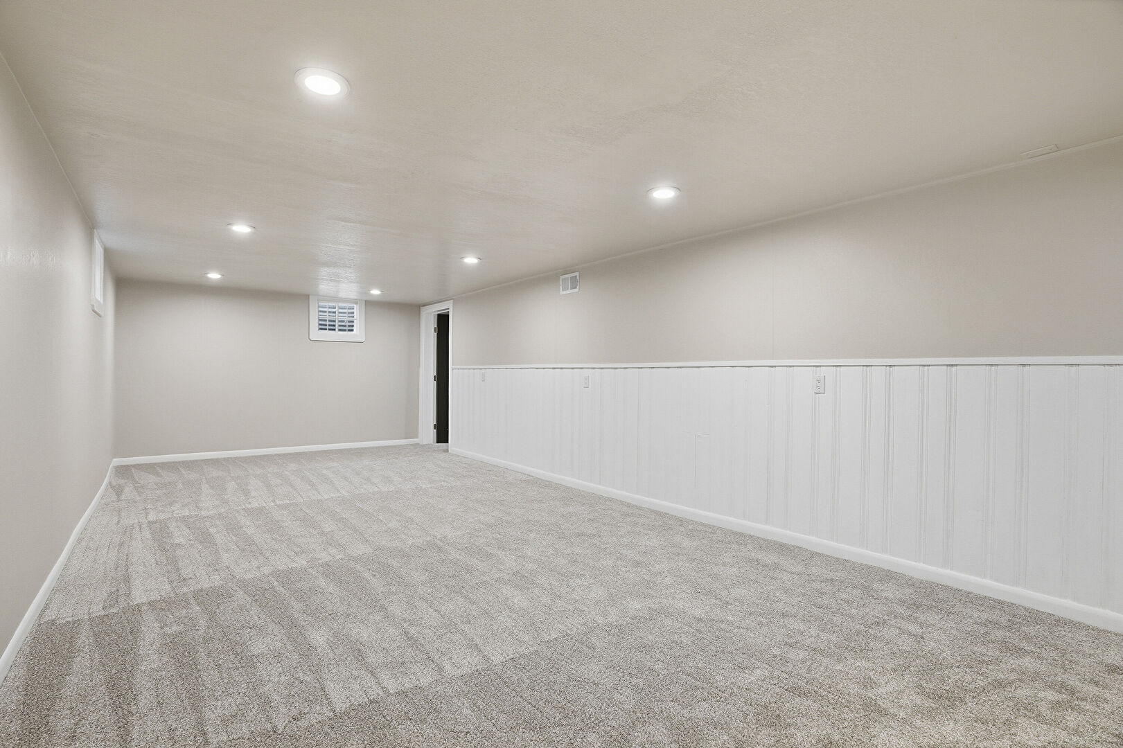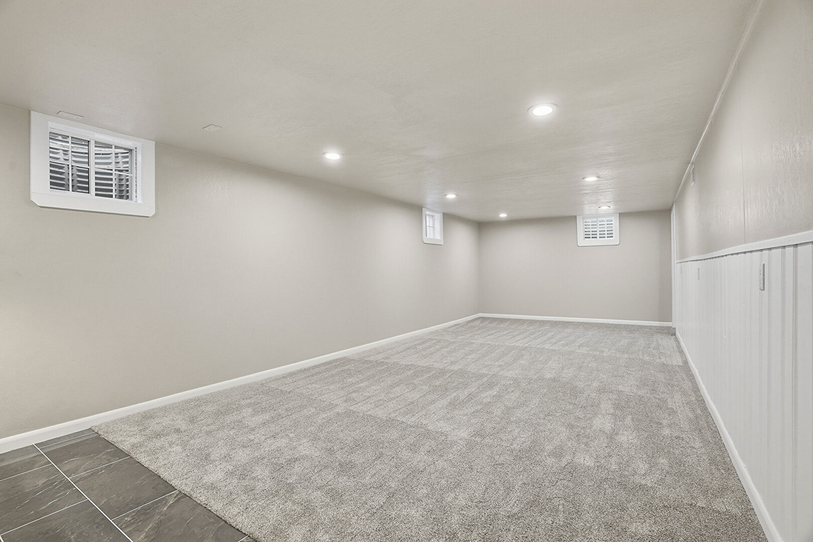 Baseboards Wall, Basement, Carpet, Drywall, Natural Light, Recessed Lighting, Stairs, Tile Floor, Vent, Wainscot Wall, Basement, Drywall, Recessed Lighting, Stairs