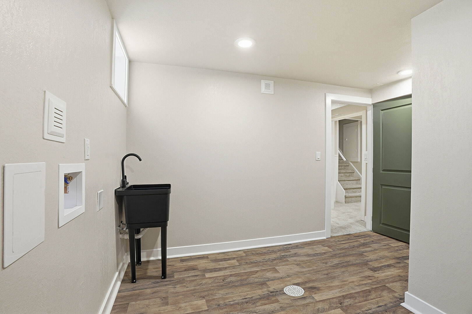 Baseboards Wall, Basement, Drywall, Electric Dryer Hookup, Laundry, Natural Light, Recessed Lighting, Vent, Washer Hookup, Wood Finish Floor, Natural Light, Recessed Lighting, Washer Hookup