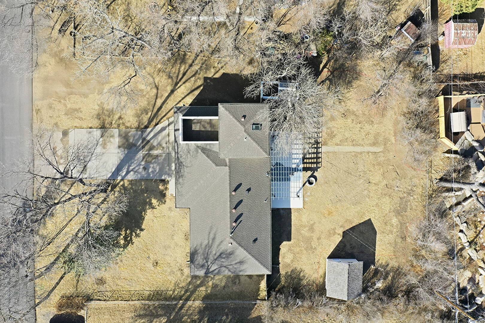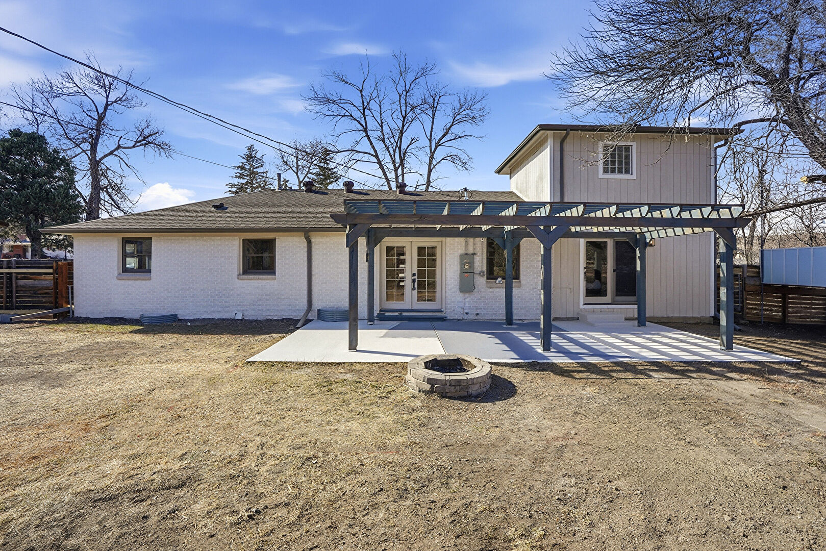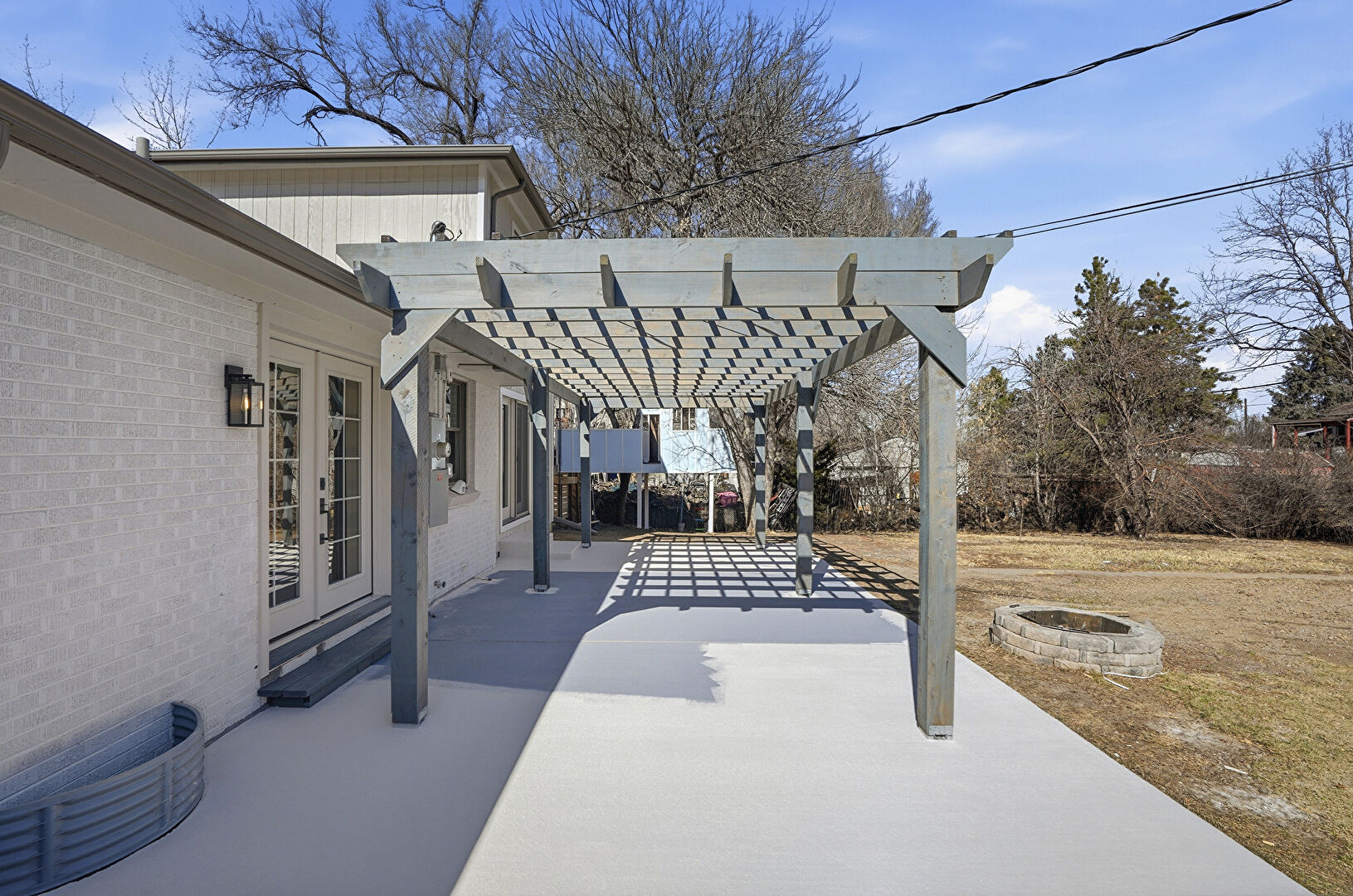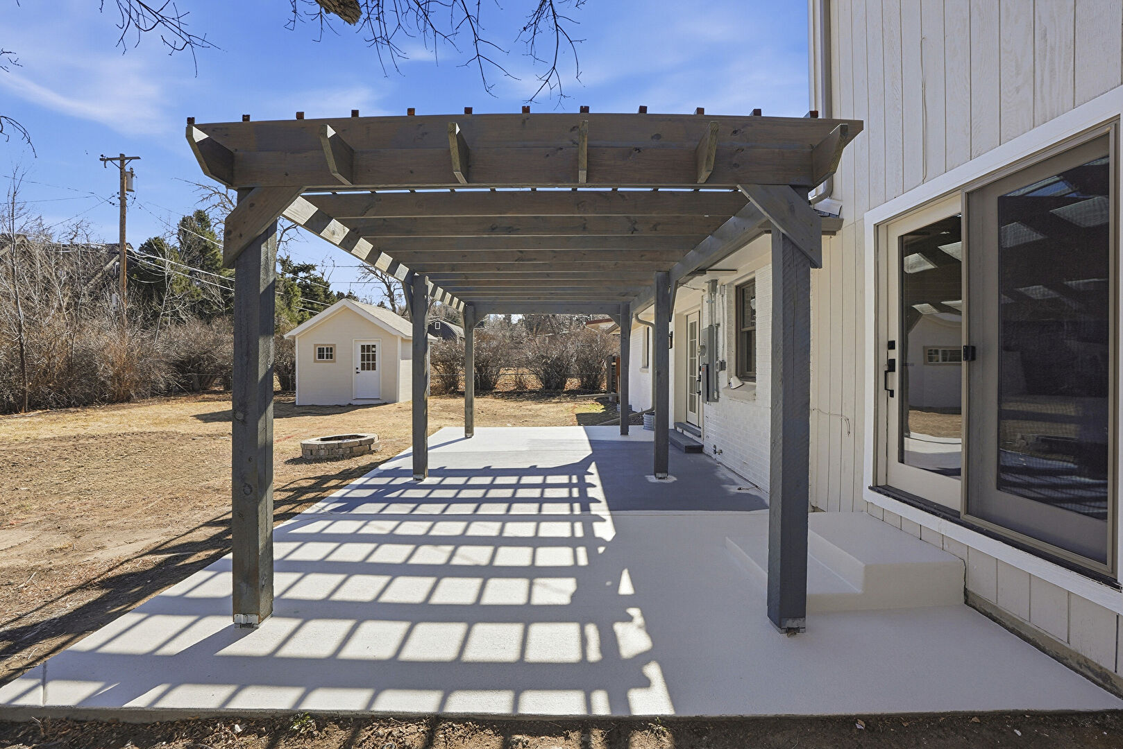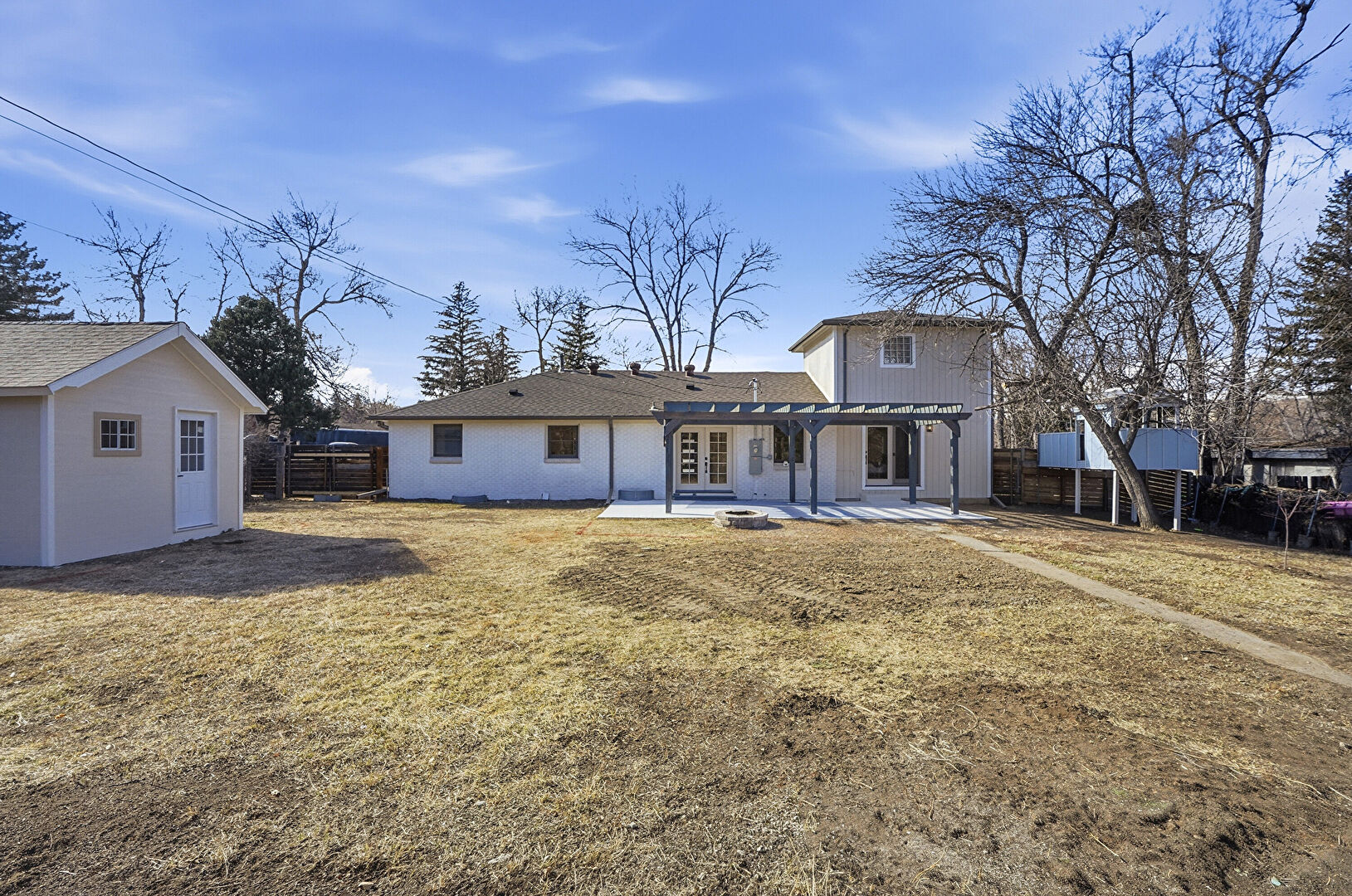 Fence, Fire Pit, Lawn, Outdoor Structure, Patio, Pergola, Satellite Dish, French Doors, Patio, Pergola, Shed