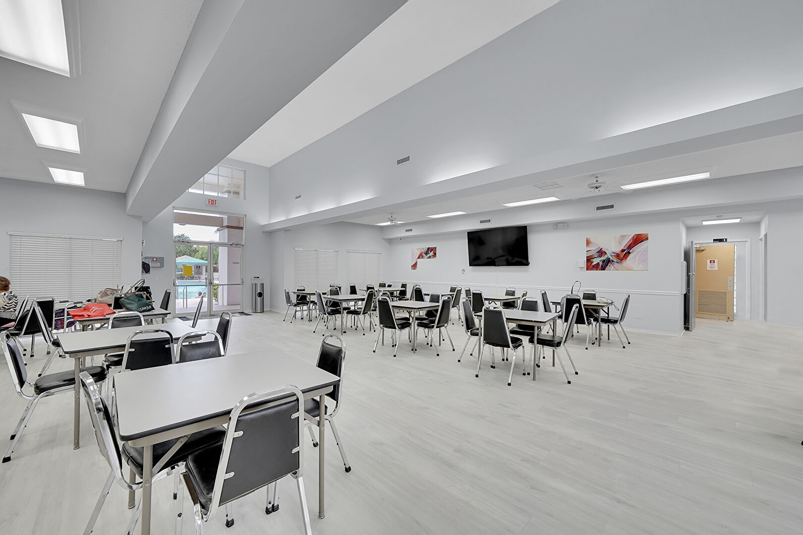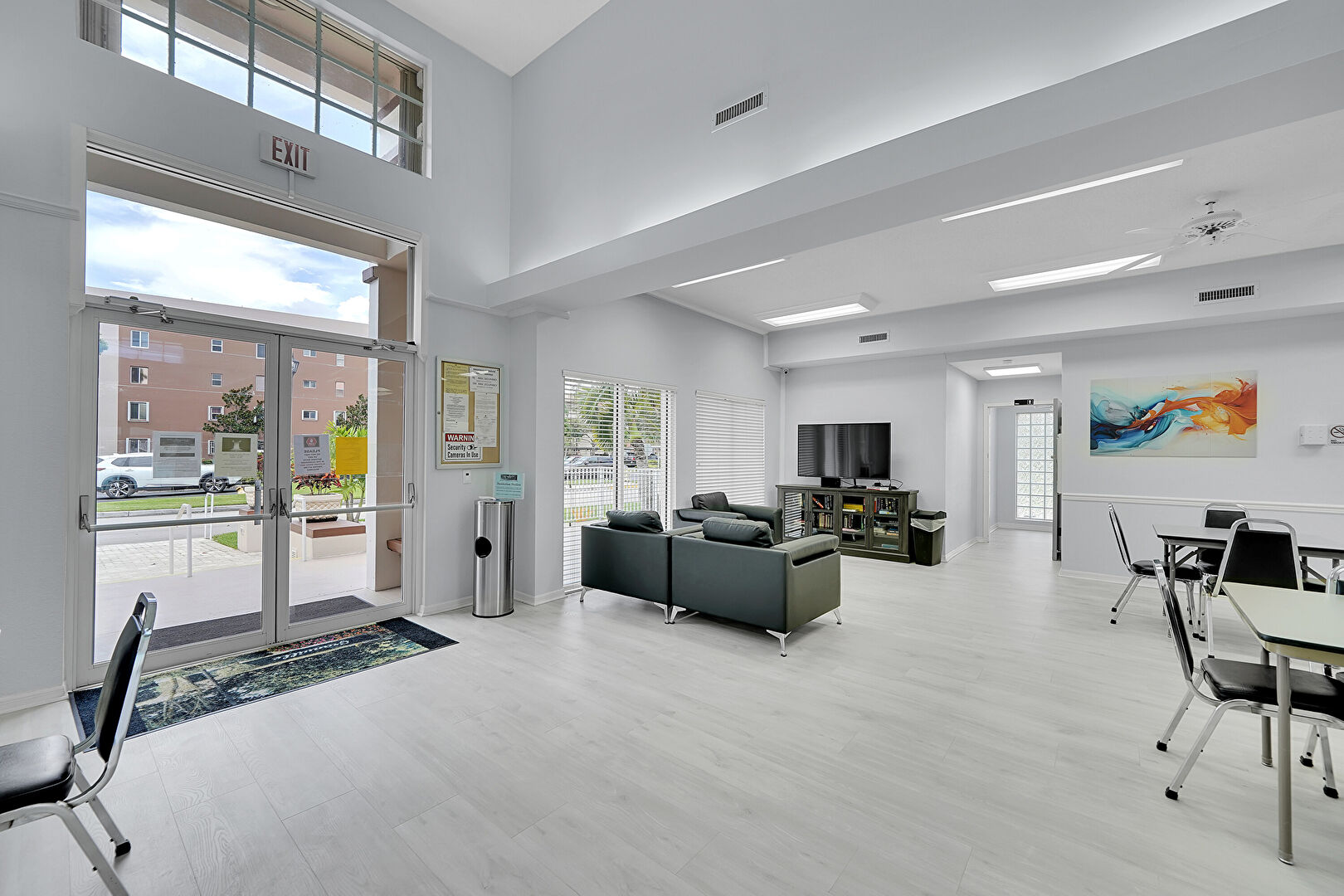 Baseboards Wall, Drywall, High Ceiling, Natural Light, Stucco Siding, Commercial View, Lawn, Vent, Wood Finish Floor