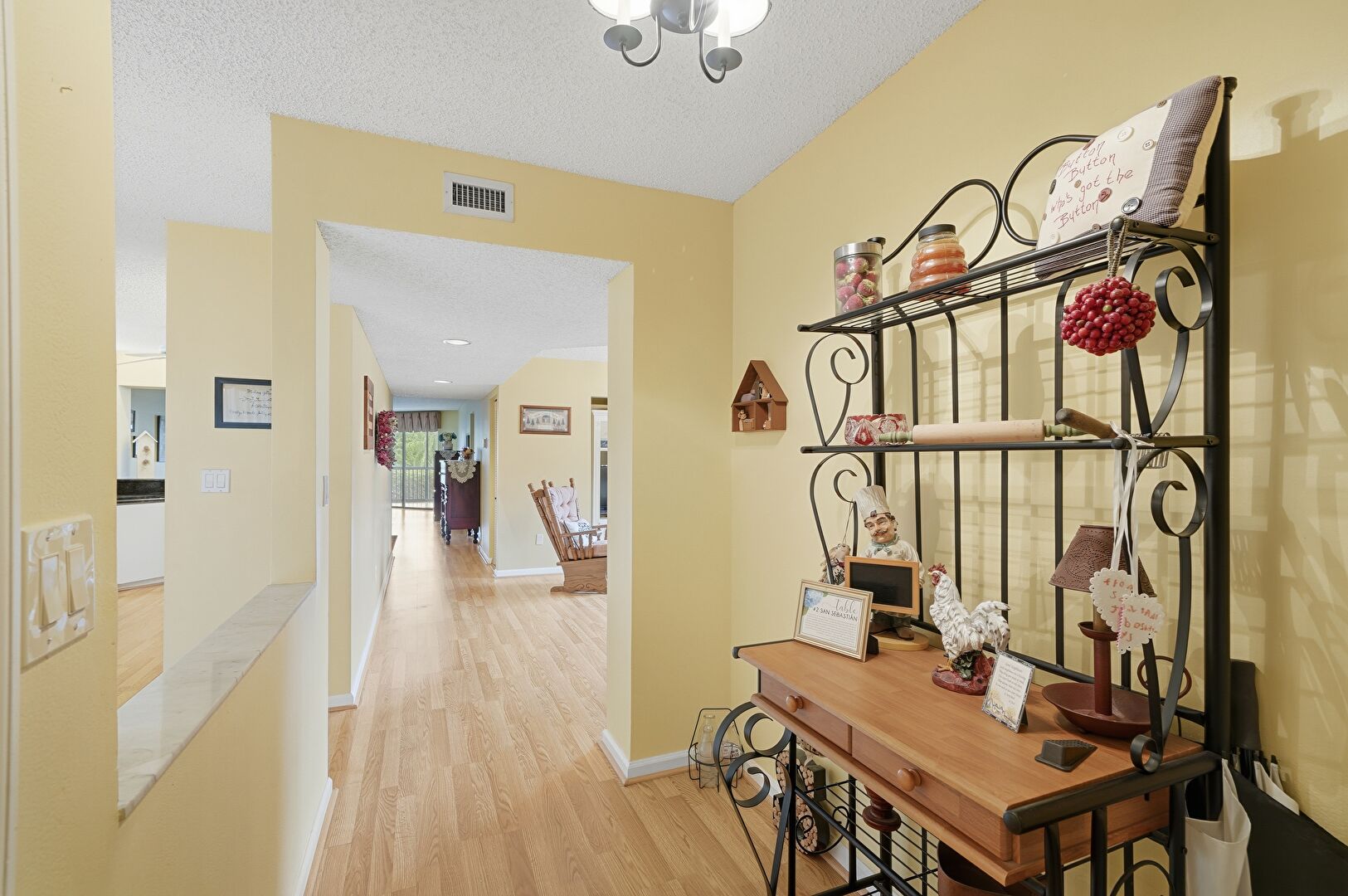 Drywall, Notable Chandelier, Recessed Lighting, Textured Ceiling, Vent, Wood Finish Floor, Baseboards Wall
