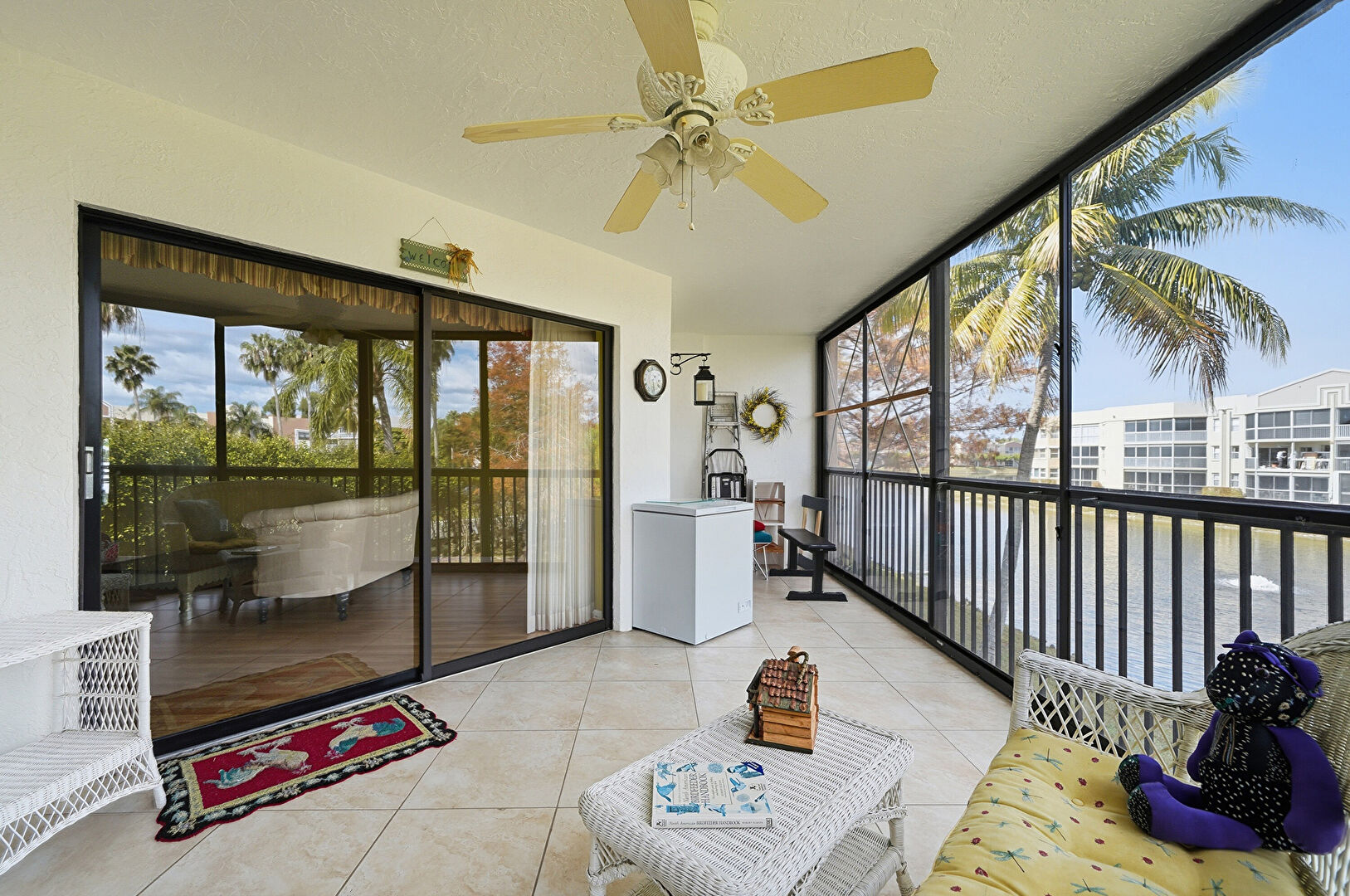 Apartment Complex View, Balcony, Ceiling Fan, Drywall, Floor Ceiling Windows, Natural Light, Sunroom, Textured Ceiling, Tile Floor, Water View, Waterfront, Apartment Complex View, Balcony, Floor Ceiling Windows, Natural Light