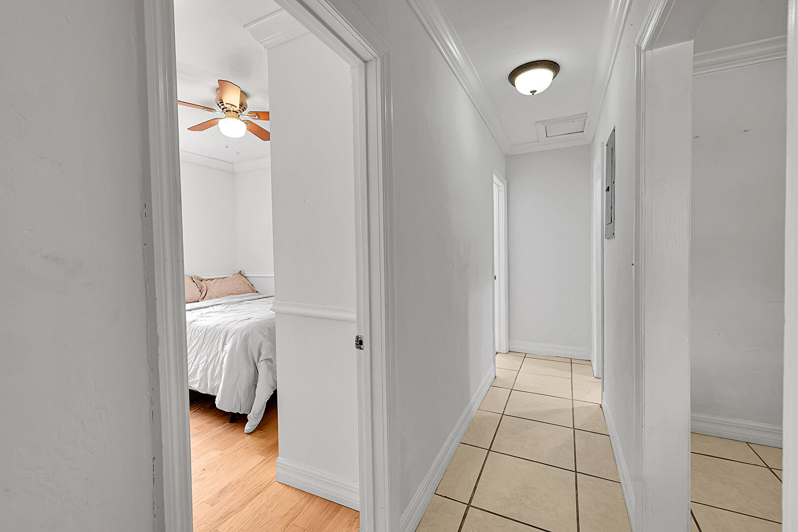 Baseboards Wall, Crown Molding, Drywall, Electric Panel, Natural Light, Scuttle, Tile Floor, Wood Finish Floor, Baseboards Wall, Tile Floor