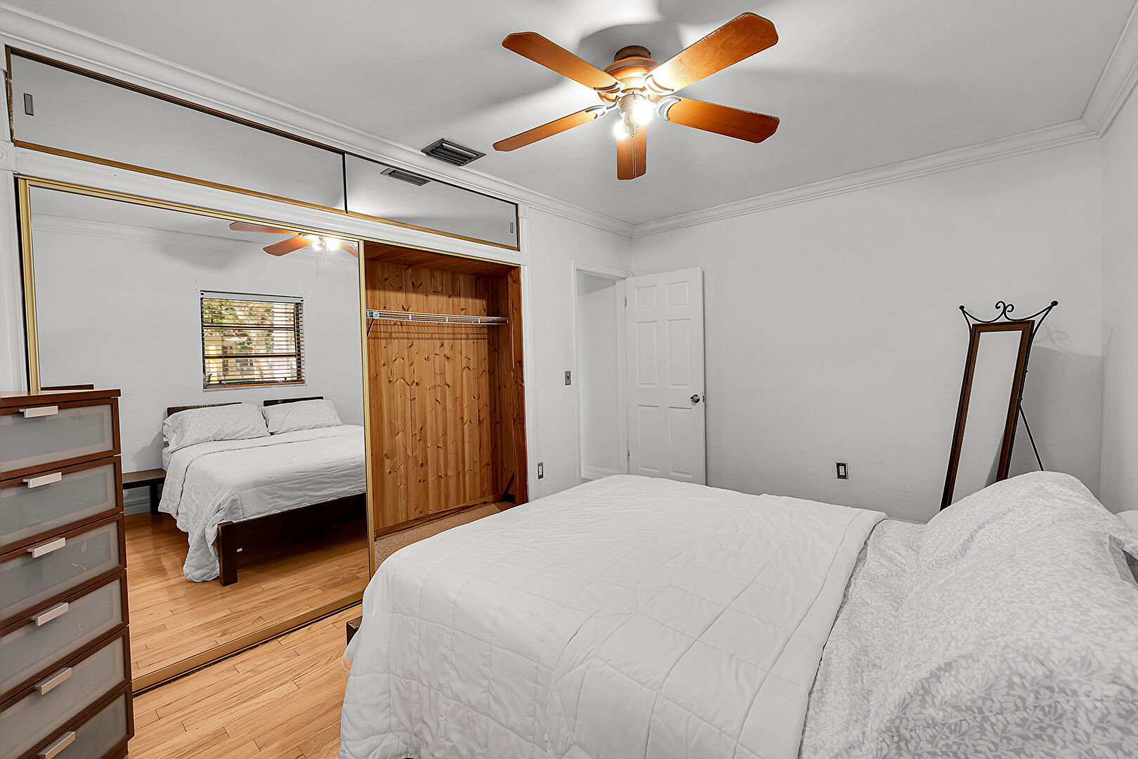 Baseboards Wall, Cathedral Ceiling, Ceiling Fan, Closet, Crown Molding, Drywall, French Doors, Natural Light, Tile Floor, Vaulted Ceiling, Vent, Wood Finish Floor, Baseboards Wall, Ceiling Fan, Crown Molding, Natural Light, Office Area, Vaulted Ceiling, Wood Finish Floor