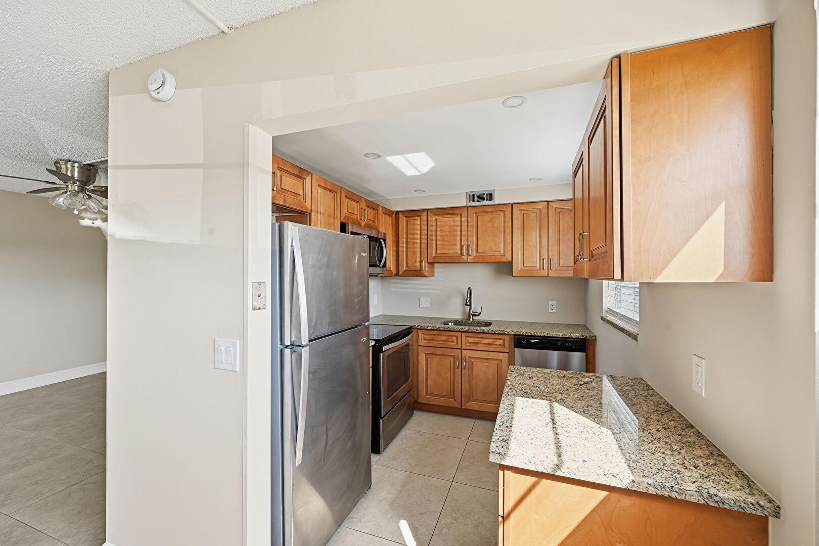 Baseboards Wall, Ceiling Fan, Drywall, Medium Brown Cabinets, Natural Light, Raised Cabinets, Smoke Carbon Monoxide Detector, Stone Countertops, Textured Ceiling, Tile Floor, U Shaped Kitchen, Vent, Drywall, Medium Brown Cabinets
