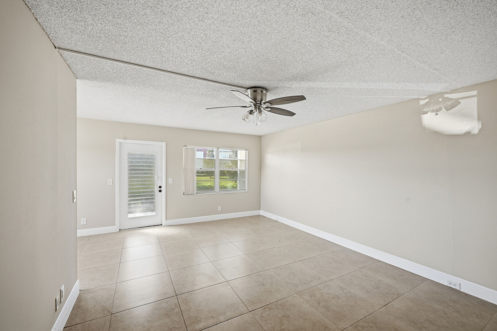 Baseboards Wall, Ceiling Fan, Drywall, Natural Light, Textured Ceiling, Tile Floor, Vent, Drywall, Textured Ceiling