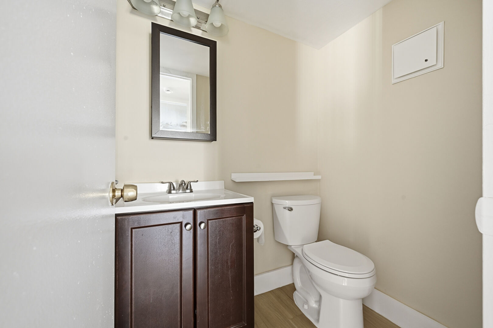 Baseboards Wall, Drywall, Half Bathroom, Vanity, Wood Finish Floor