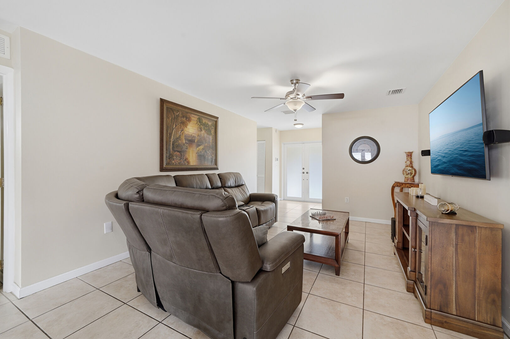 Baseboards Wall, Ceiling Fan, Drywall, French Doors, Natural Light, Smoke Carbon Monoxide Detector, Tile Floor, Drywall, French Doors, Vent