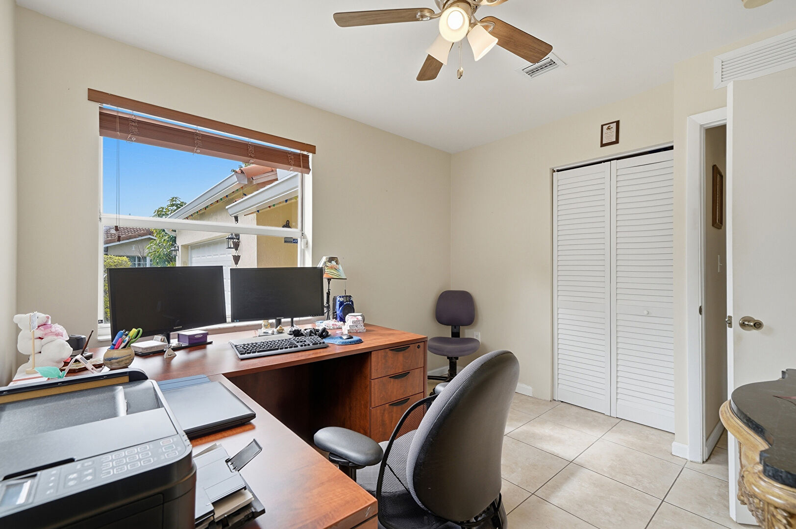 Baseboards Wall, Ceiling Fan, Drywall, Natural Light, Office Area, Tile Floor, Vent, Ceiling Fan, Office Area