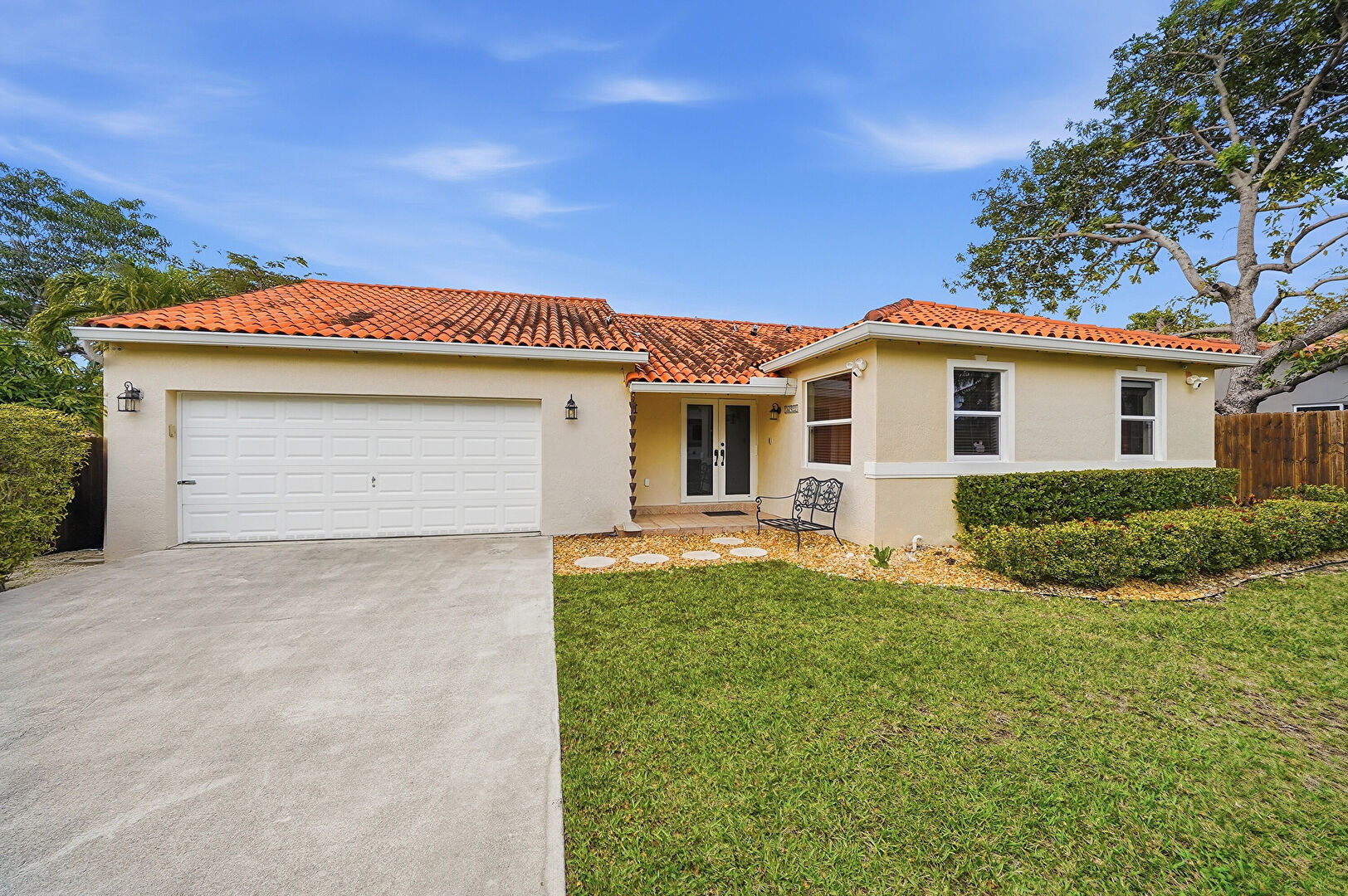 Fence, French Doors, Patio, Stucco Siding, Tile Roof, Gutters
