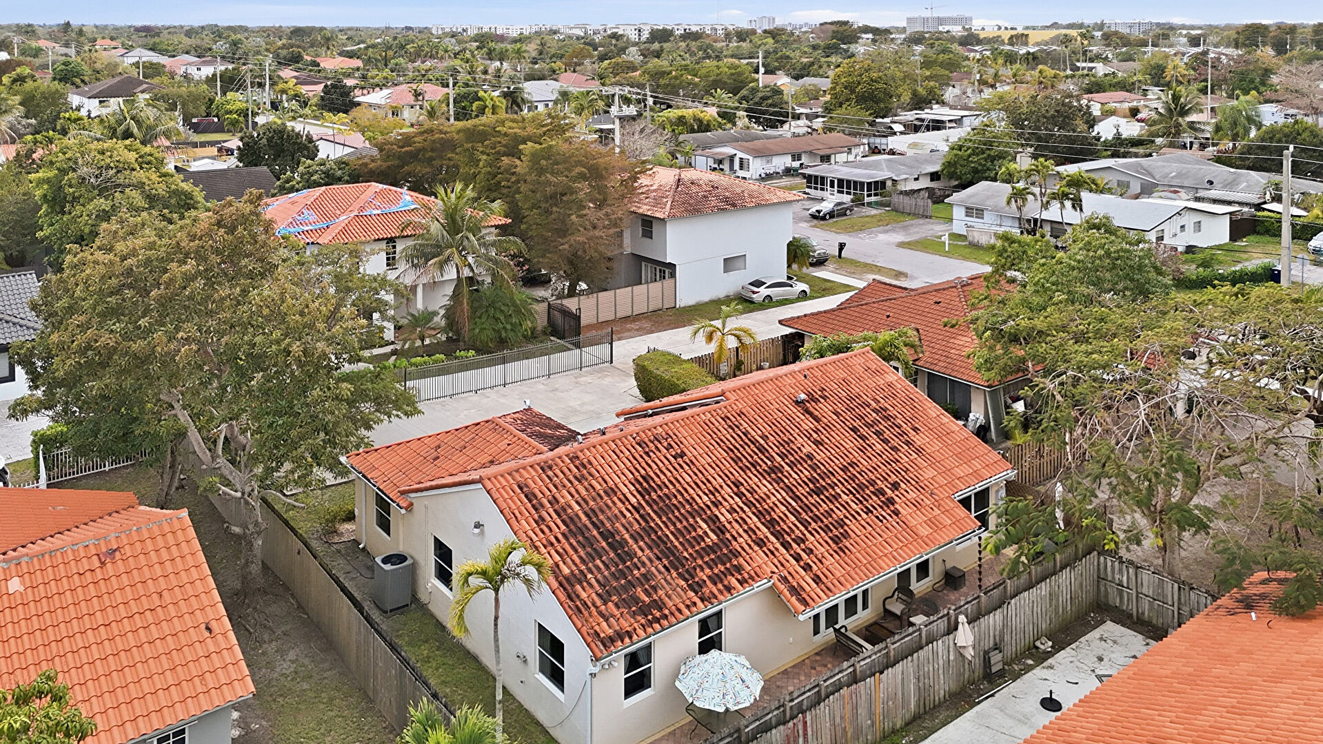 Downspout, Fence, Gutters, Lawn, Patio, Stucco Siding, Tile Roof, Central Ac
