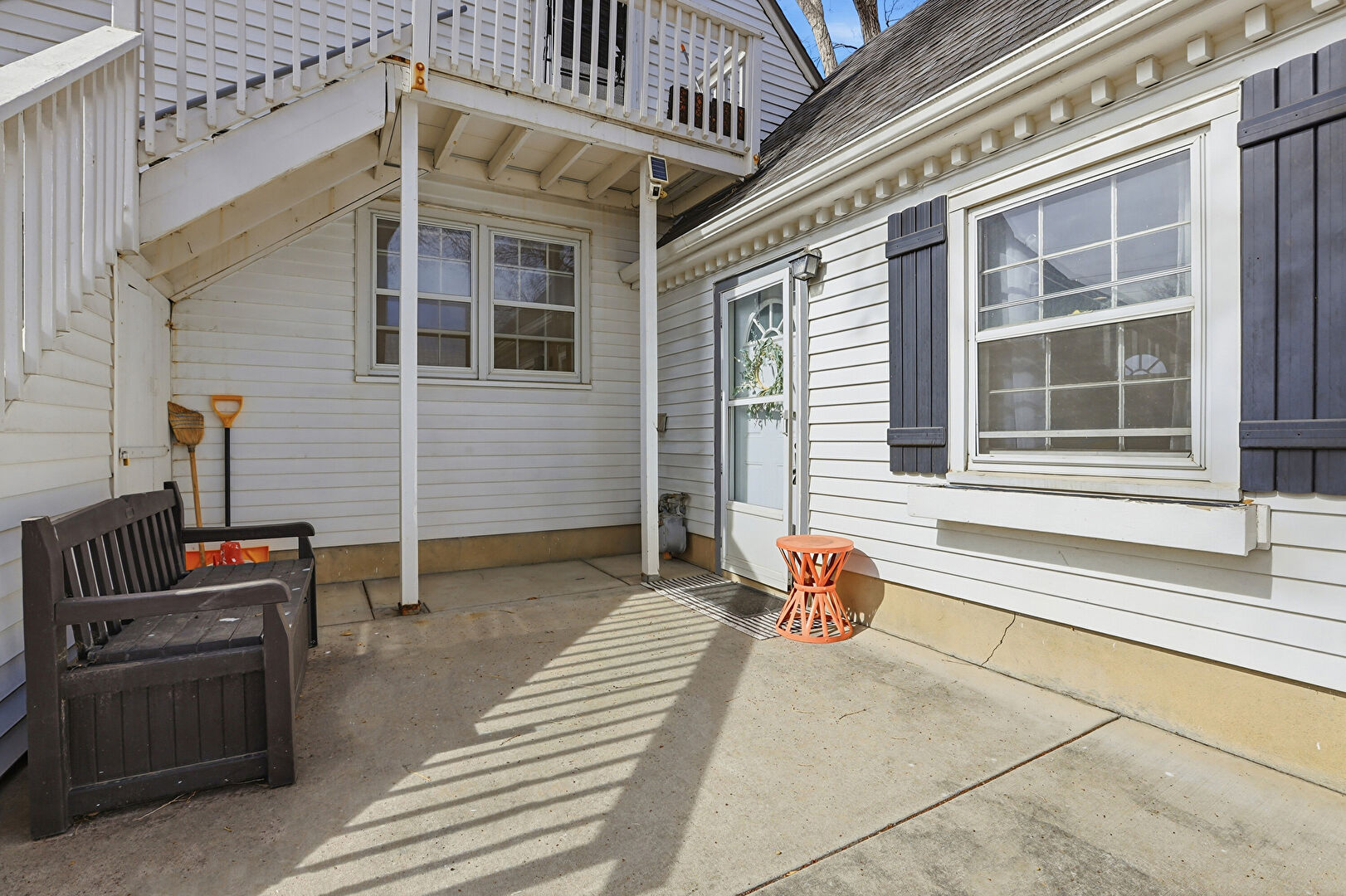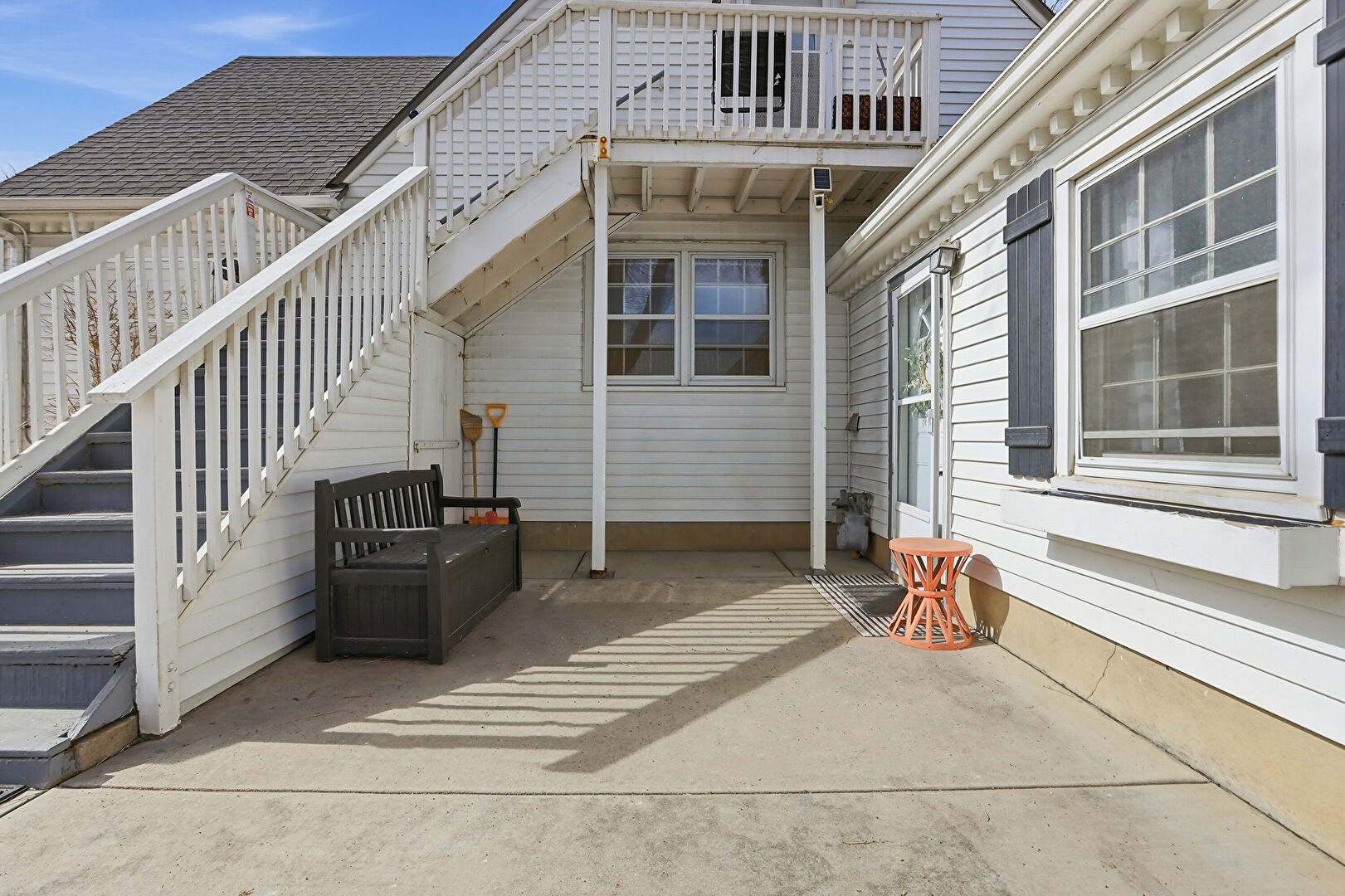 Balcony, Dormer Roof, Downspout, Gutters, Lawn, Outdoor Dining Area, Patio, Shingle Roof, Horizontal Siding, Patio, Stairs