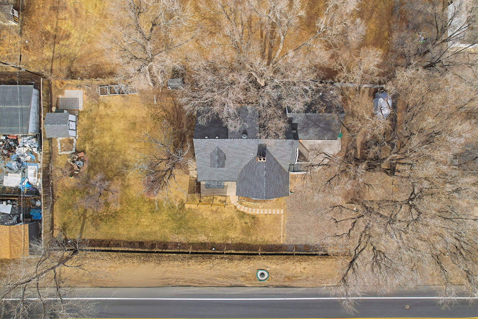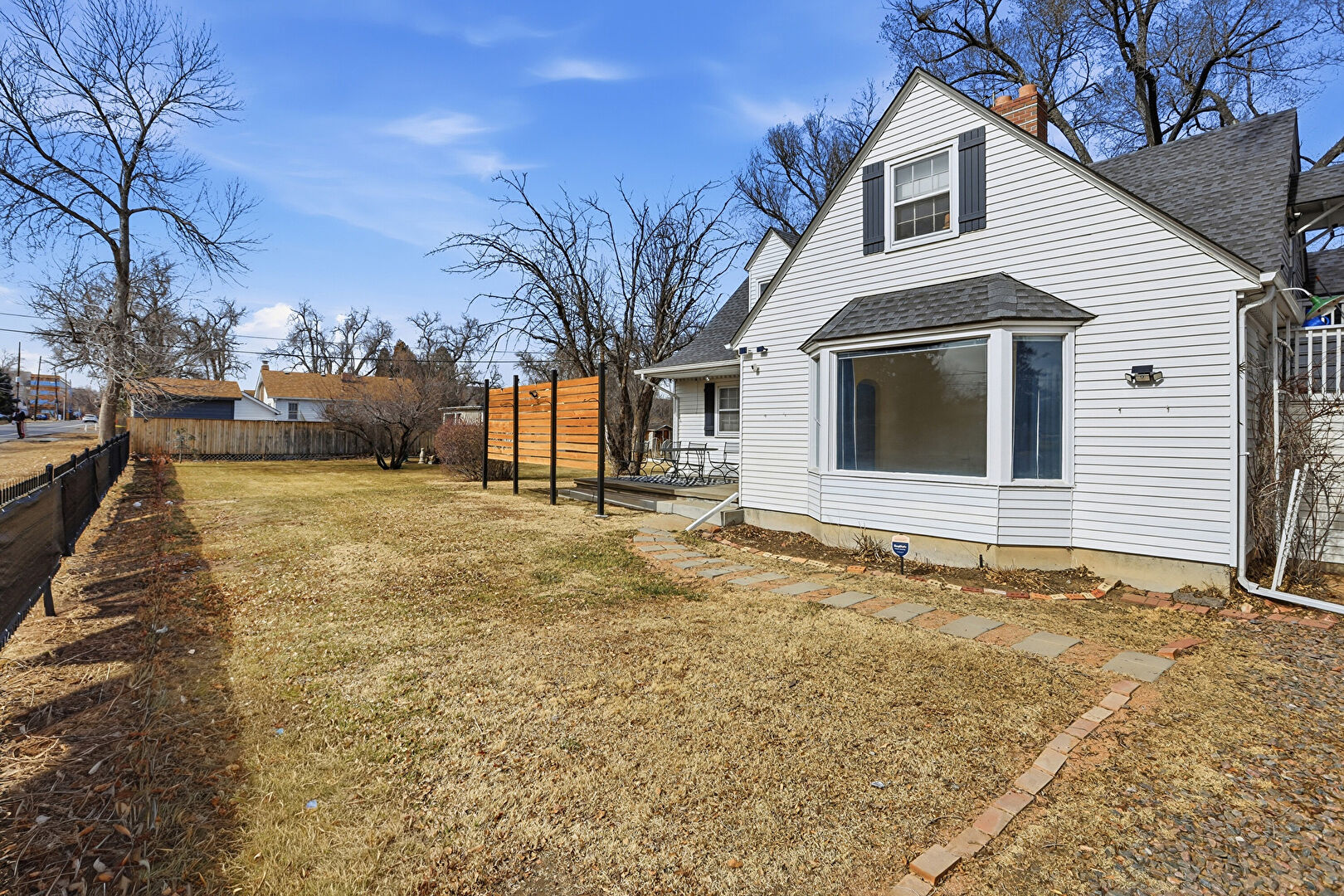 Chimney, Concrete Foundation, Downspout, Fence, Gutters, Horizontal Siding, Shingle Roof, Lawn