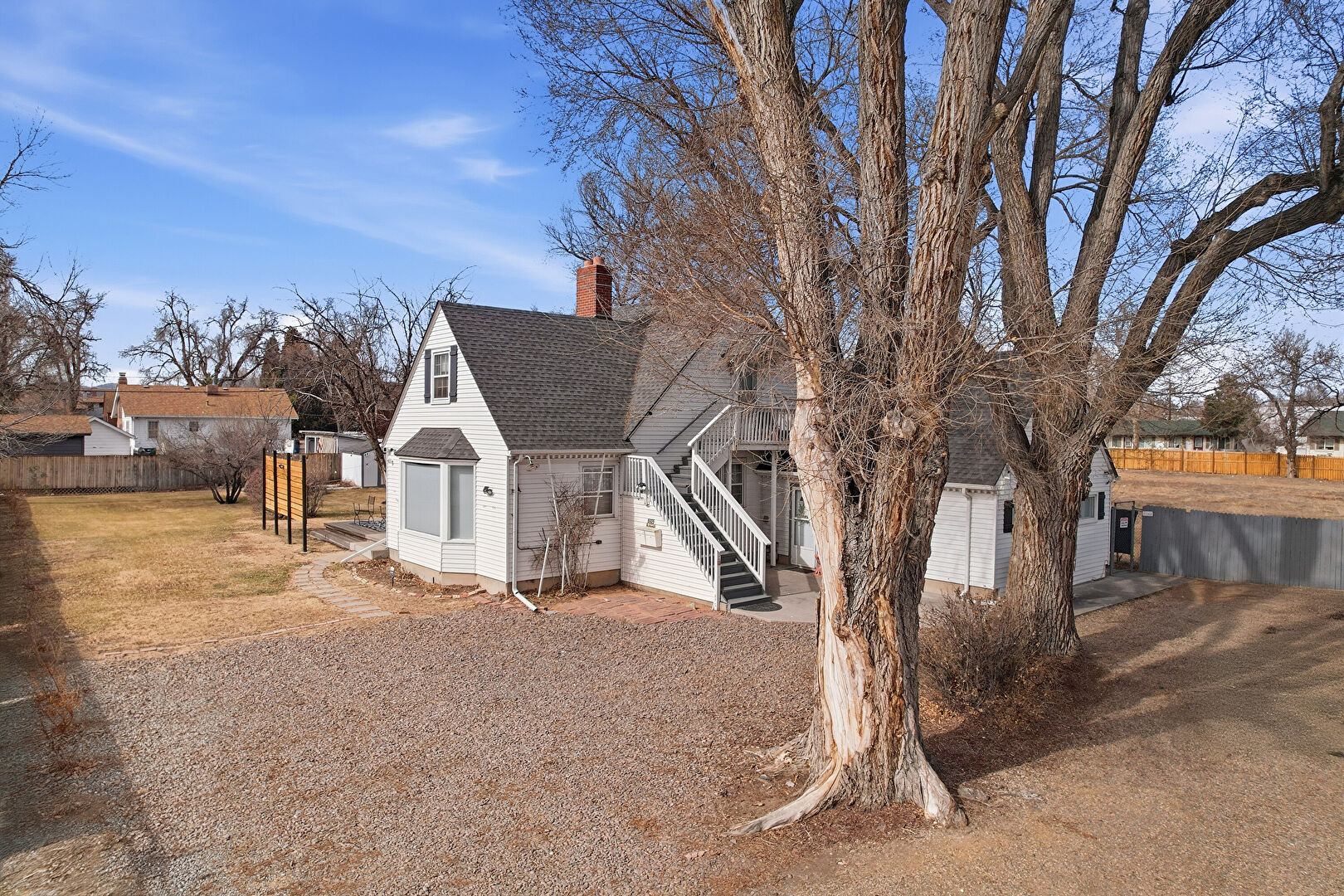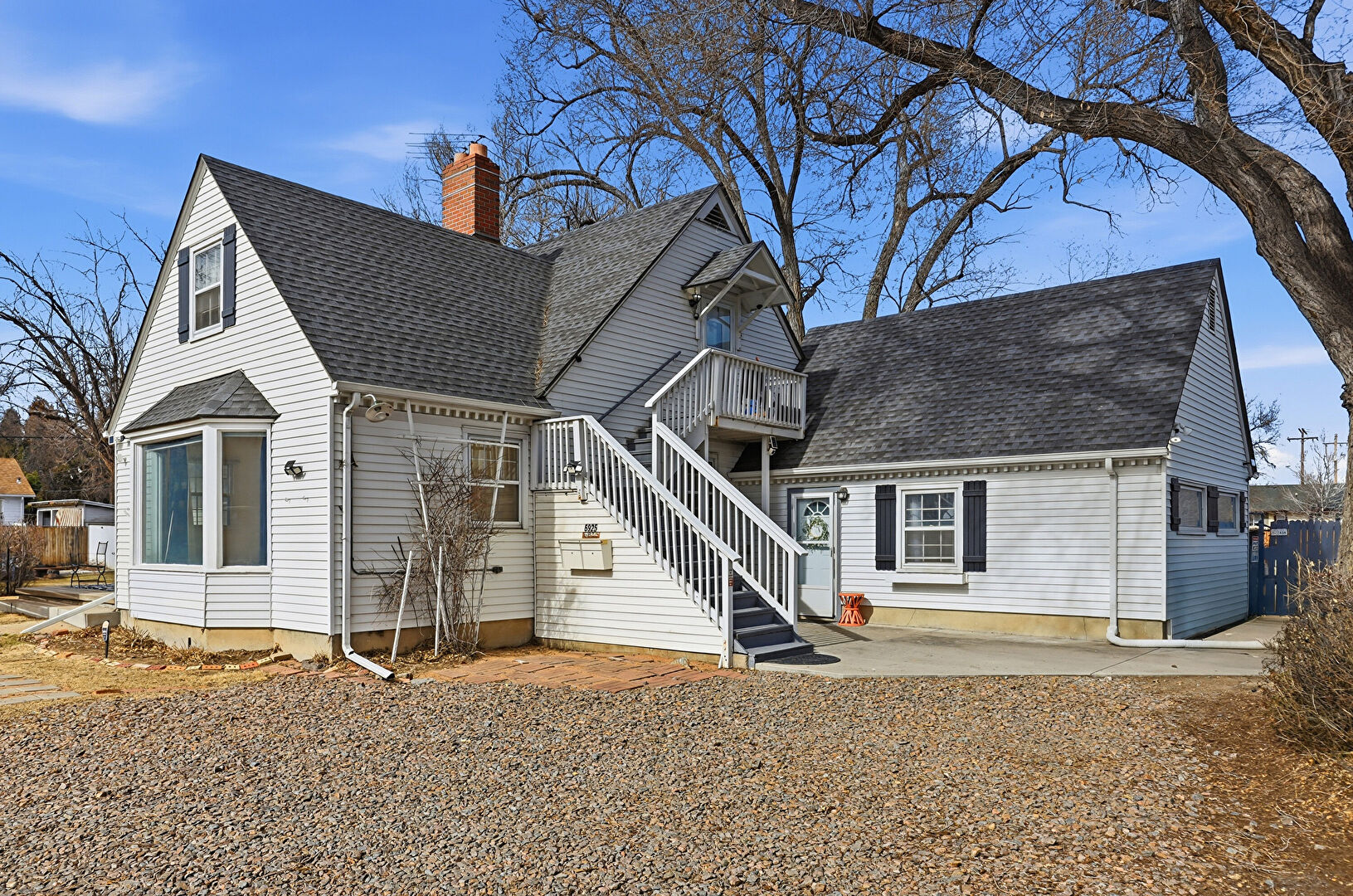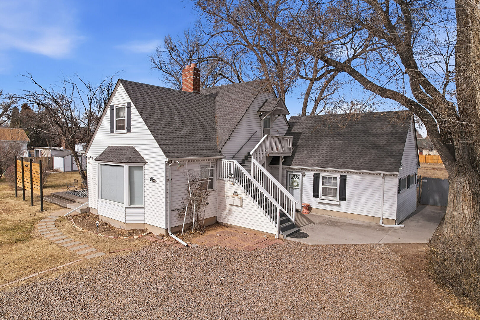 Balcony, Chimney, Concrete Foundation, Deck, Downspout, Driveway, Fence, Gutters, Horizontal Siding, Parking Pad, Patio, Shingle Roof, Stairs, Stoop, Chimney, Downspout, Gutters, Shingle Roof