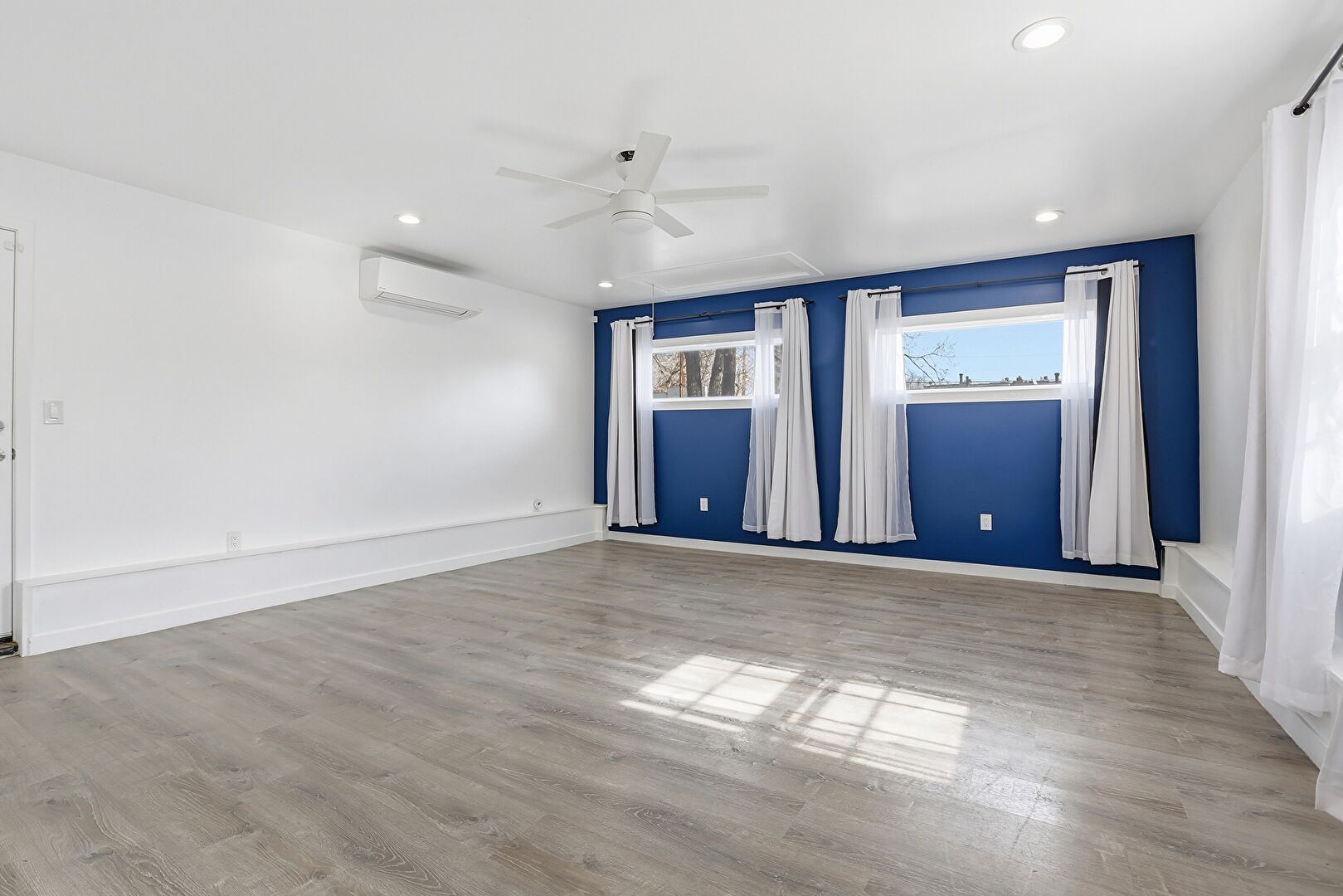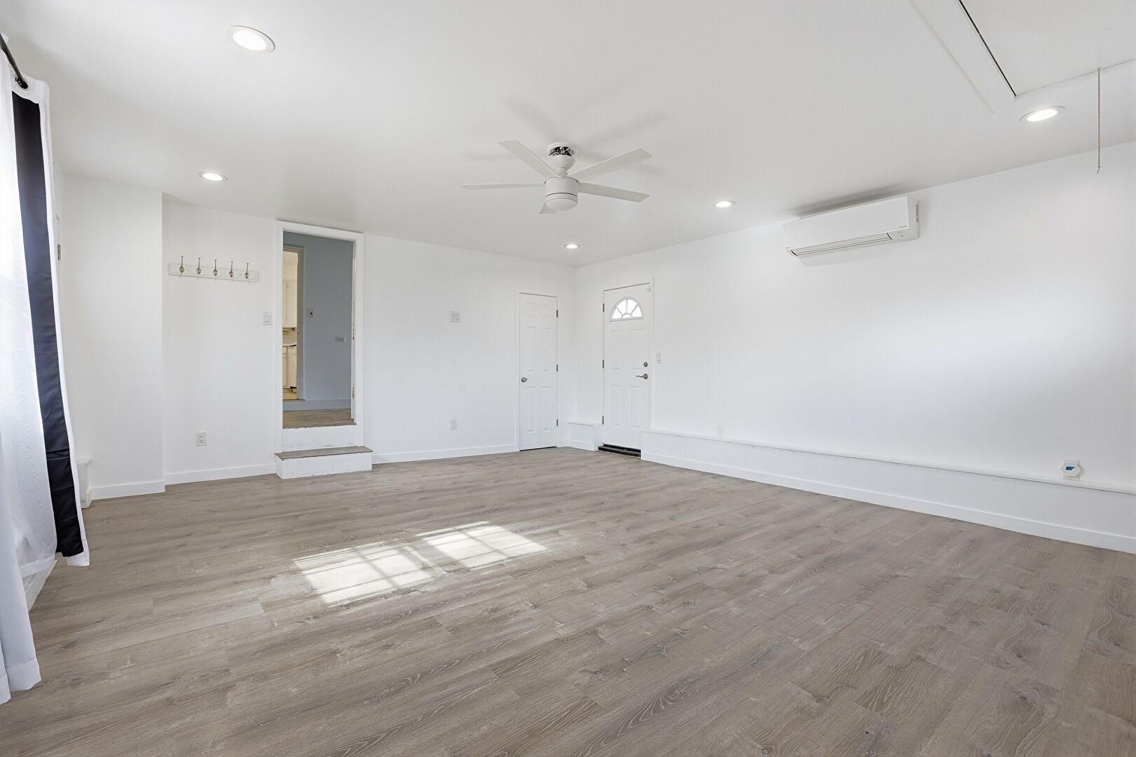 Baseboards Wall, Ceiling Fan, Drywall, Fireplace, Natural Light, Recessed Lighting, Vent, Wall Mounted Ac, Wood Finish Floor, Arched Walkways, Drop Stairs, Natural Light, Wood Finish Floor