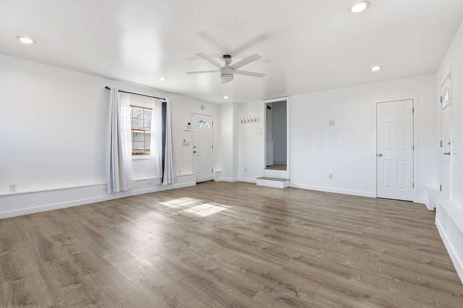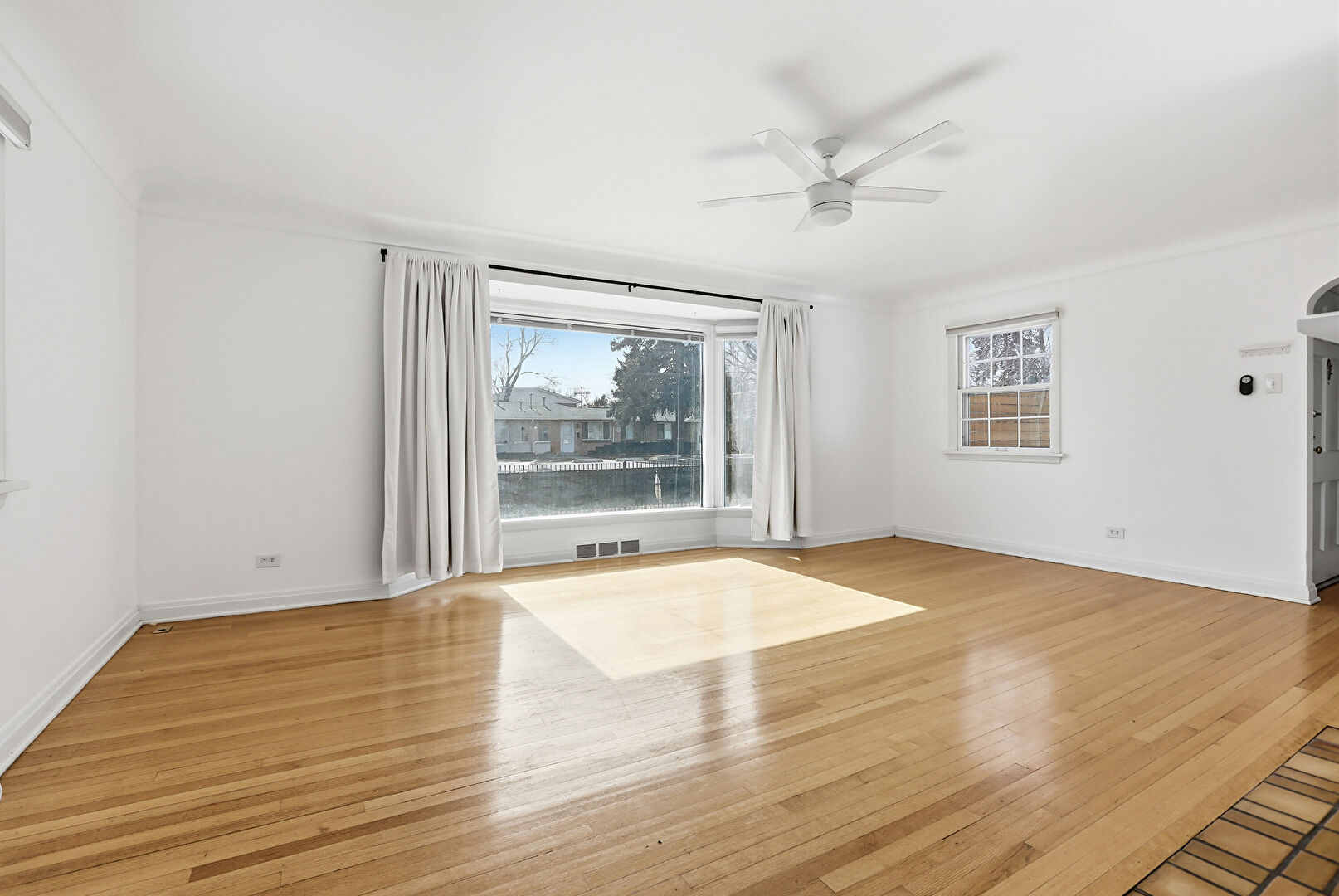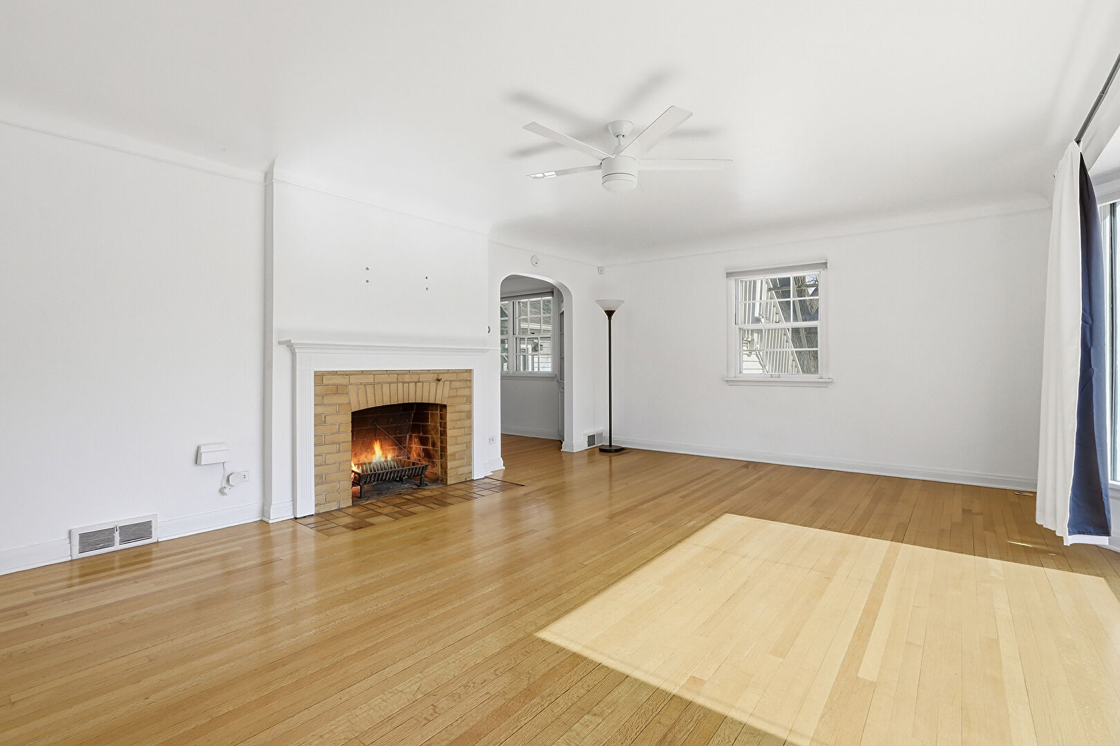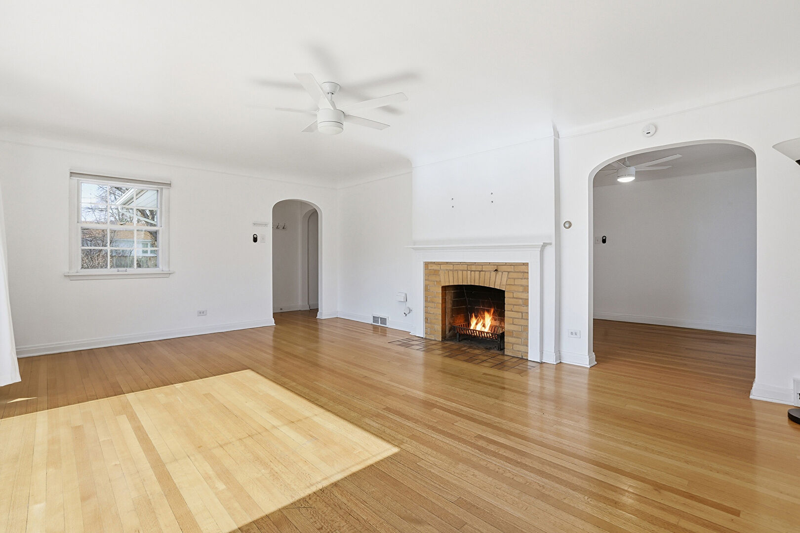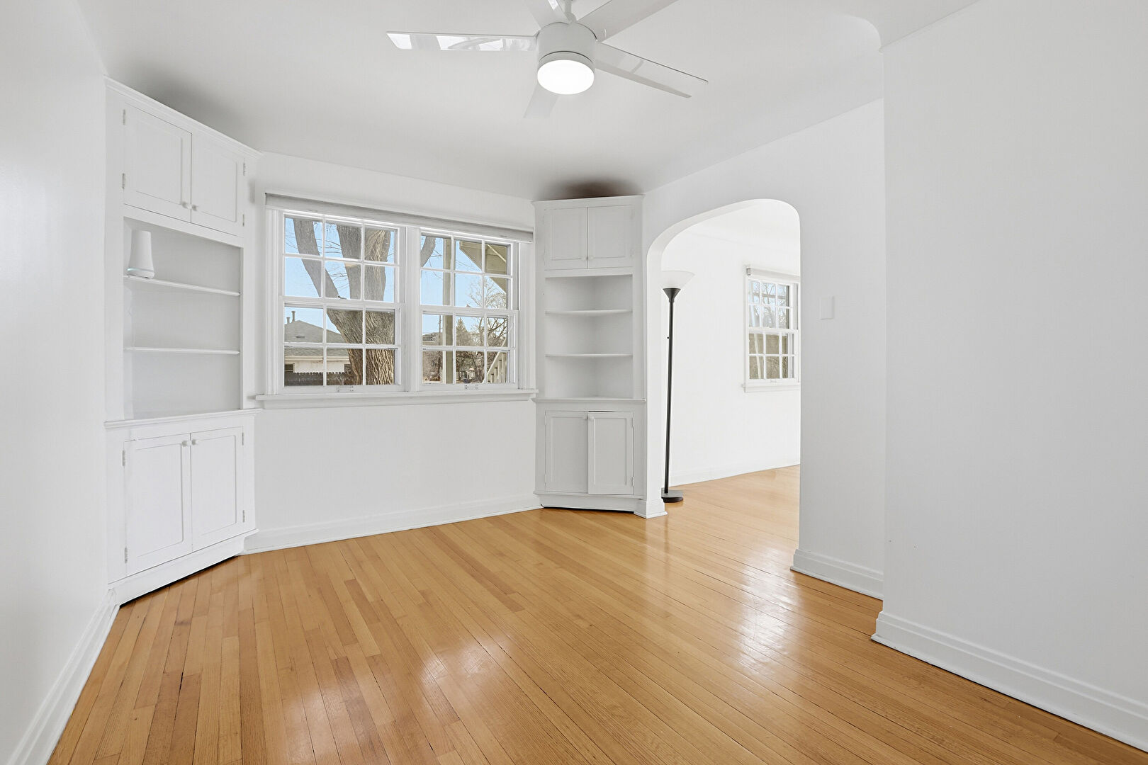 Arched Walkways, Ceiling Fan, Drywall, Natural Light, Wood Finish Floor, Baseboards Wall