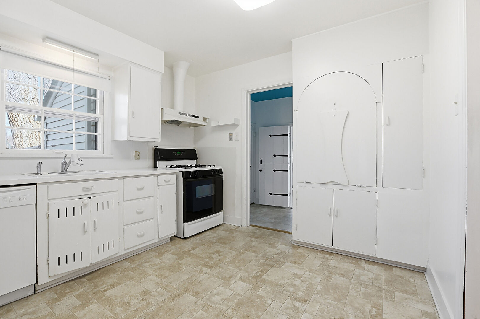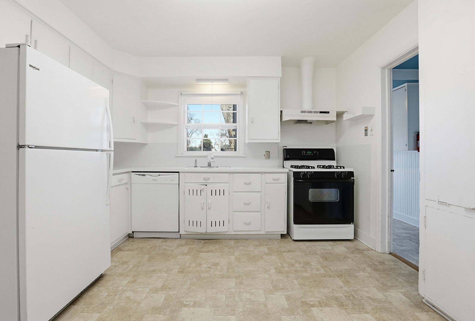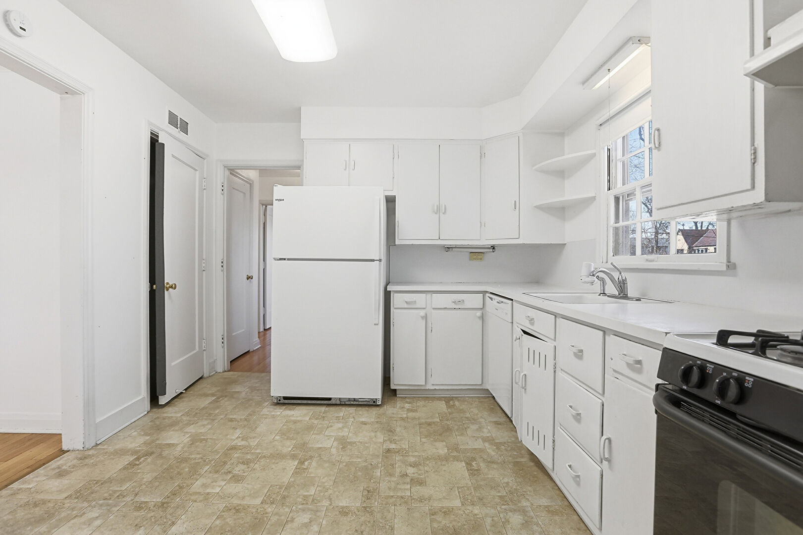 Baseboards Wall, Drywall, L Shaped Kitchen, Natural Light, Open Shelves, Smoke Carbon Monoxide Detector, Stone Finish Floor, Visible Hinge Cabinets, Natural Light, Open Shelves, Stone Finish Floor, Vent