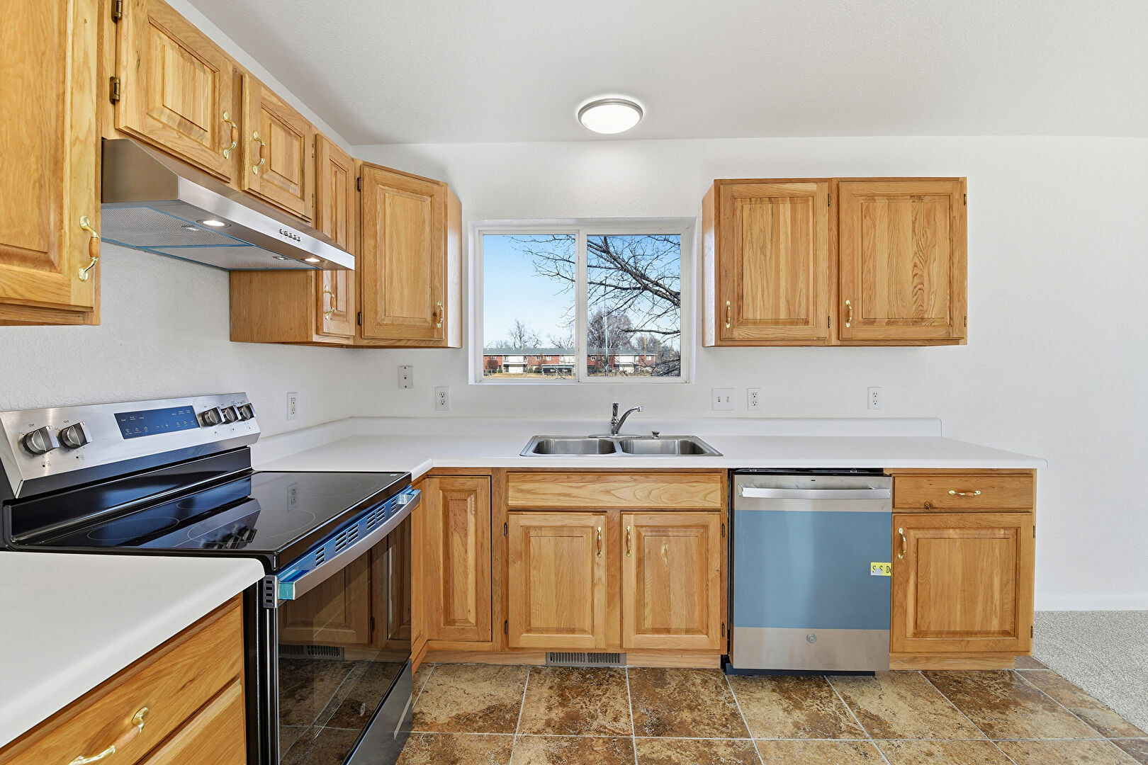 Baseboards Wall, Drywall, L Shaped Kitchen, Medium Brown Cabinets, Natural Light, Raised Cabinets, Stone Finish Floor, Vent, Visible Hinge Cabinets, Natural Light, Stone Finish Floor, Visible Hinge Cabinets