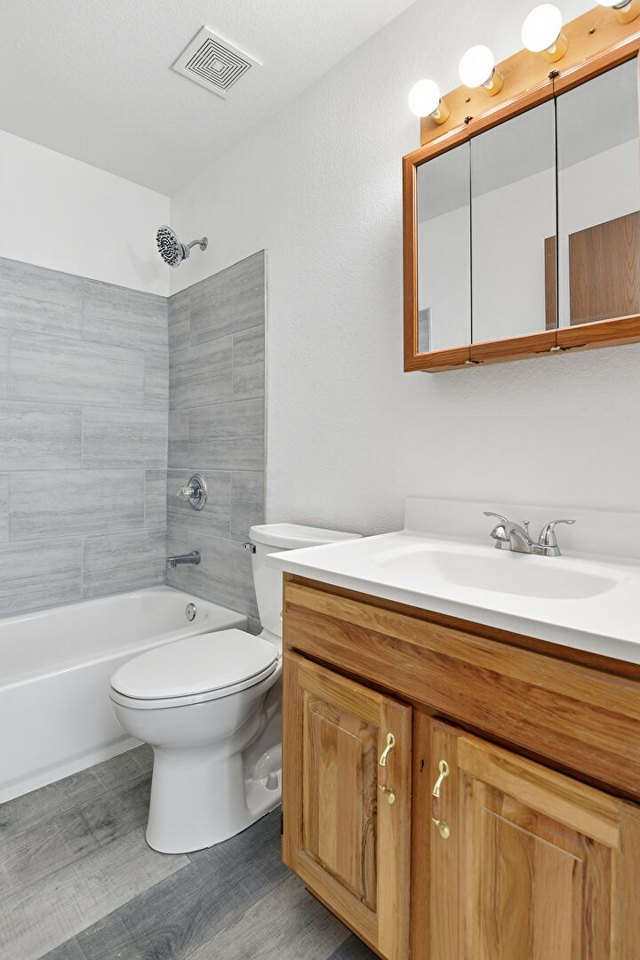Combined Bath Shower, Drywall, Full Bathroom, Textured Wall, Vanity, Vent, Vinyl Floor, Combined Bath Shower, Full Bathroom