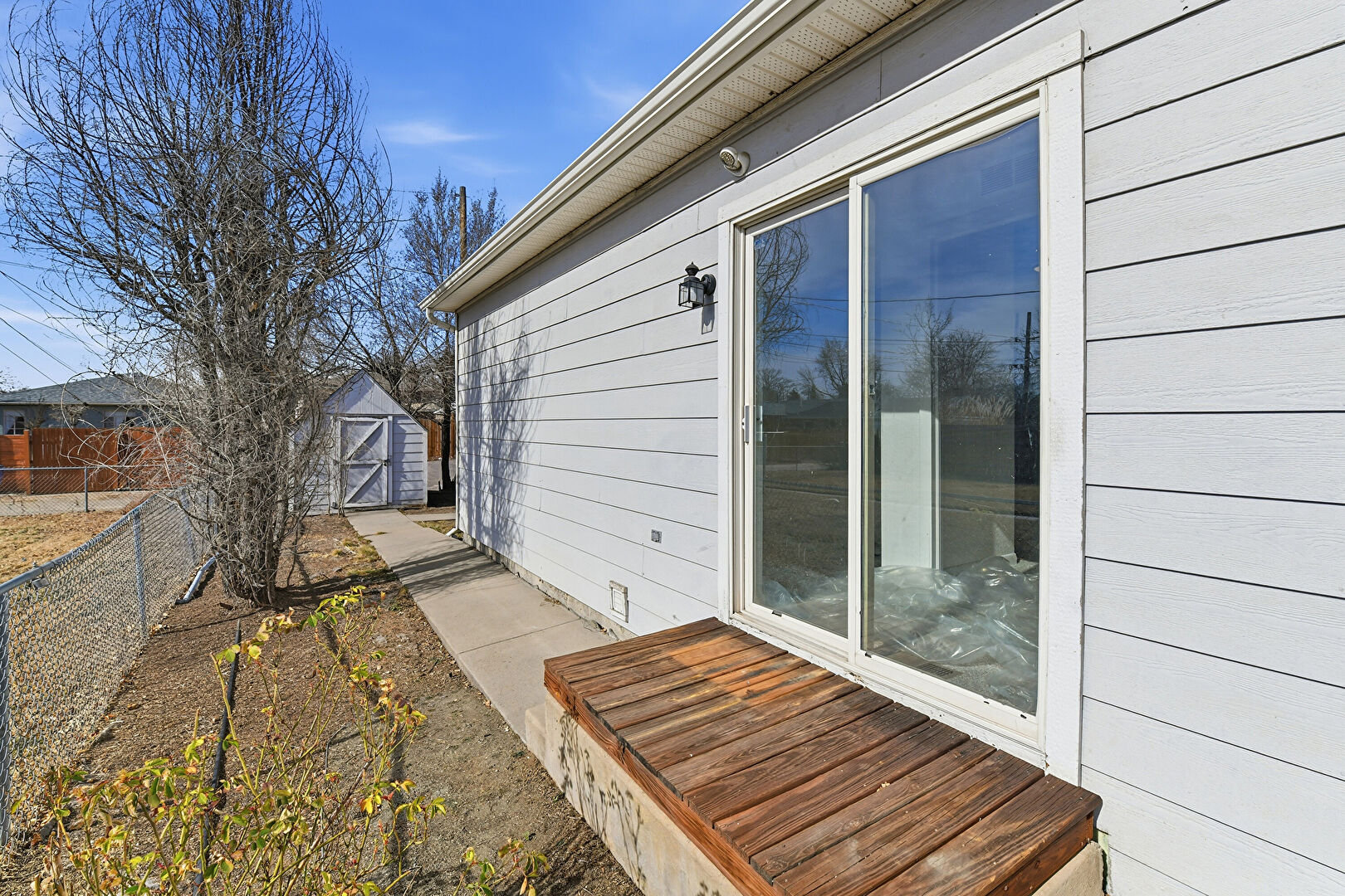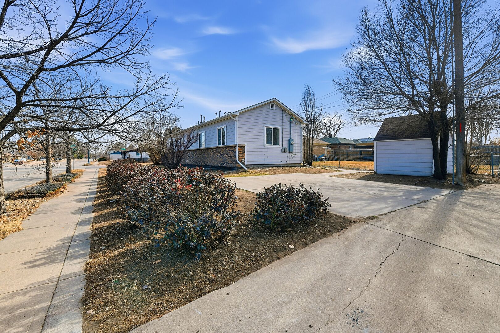 Concrete Foundation, Downspout, Driveway, Fence, Gutters, Horizontal Siding, Outdoor Structure, Parking Pad, Shed