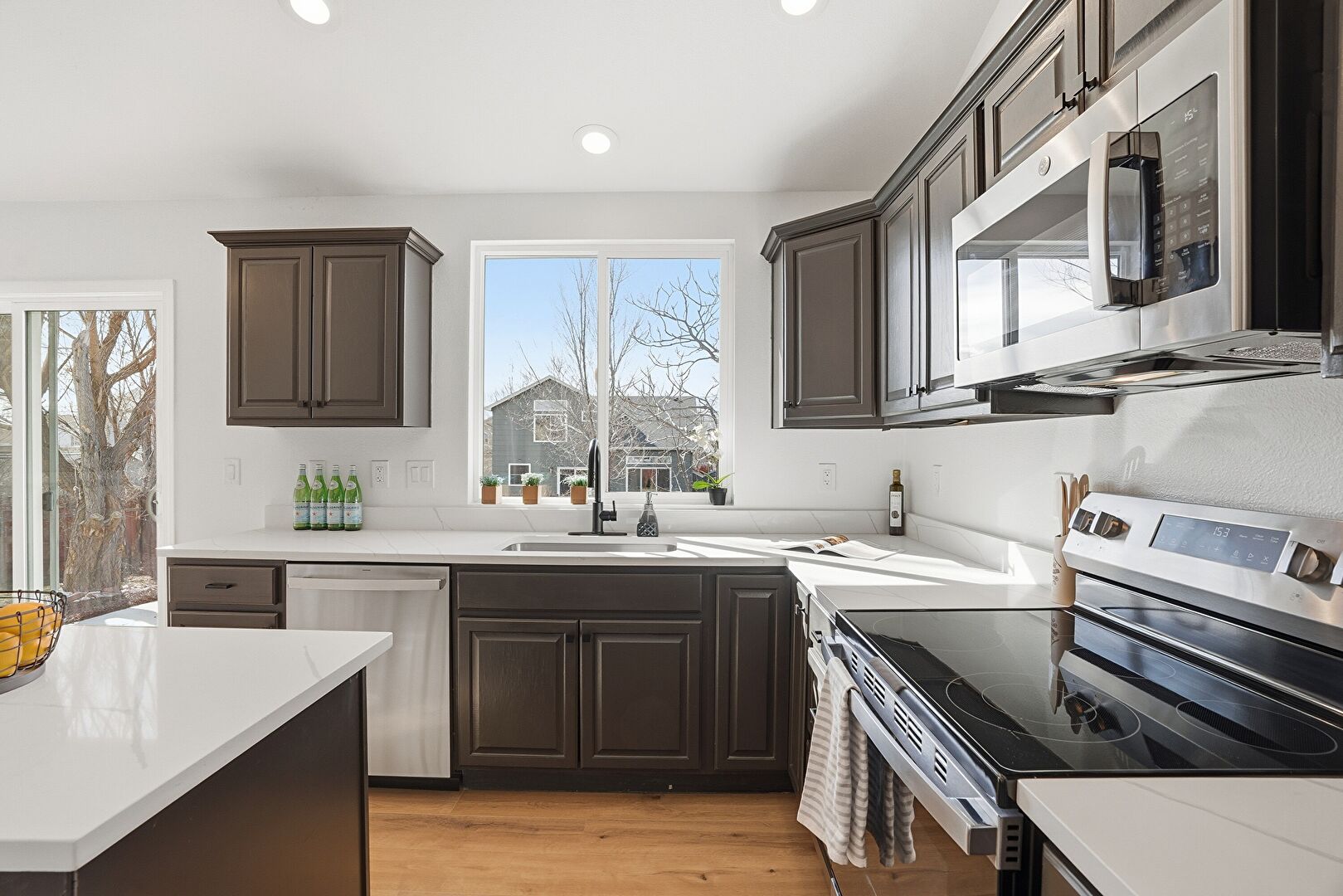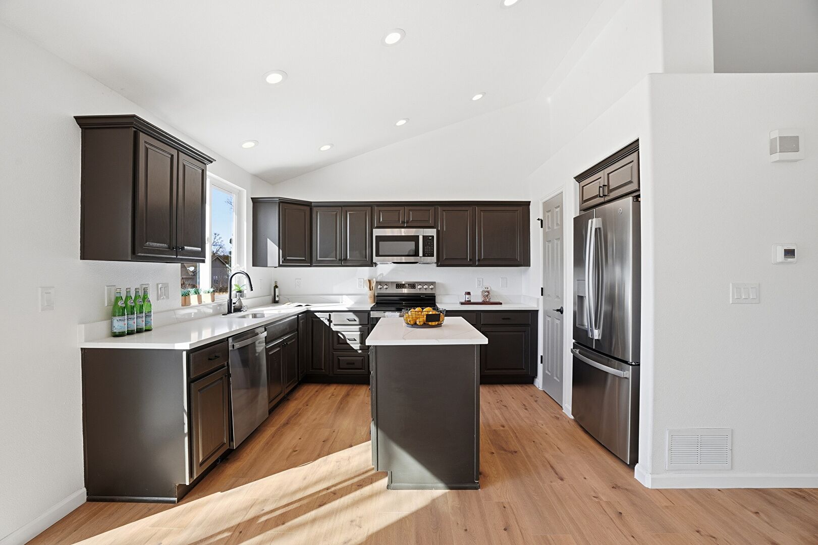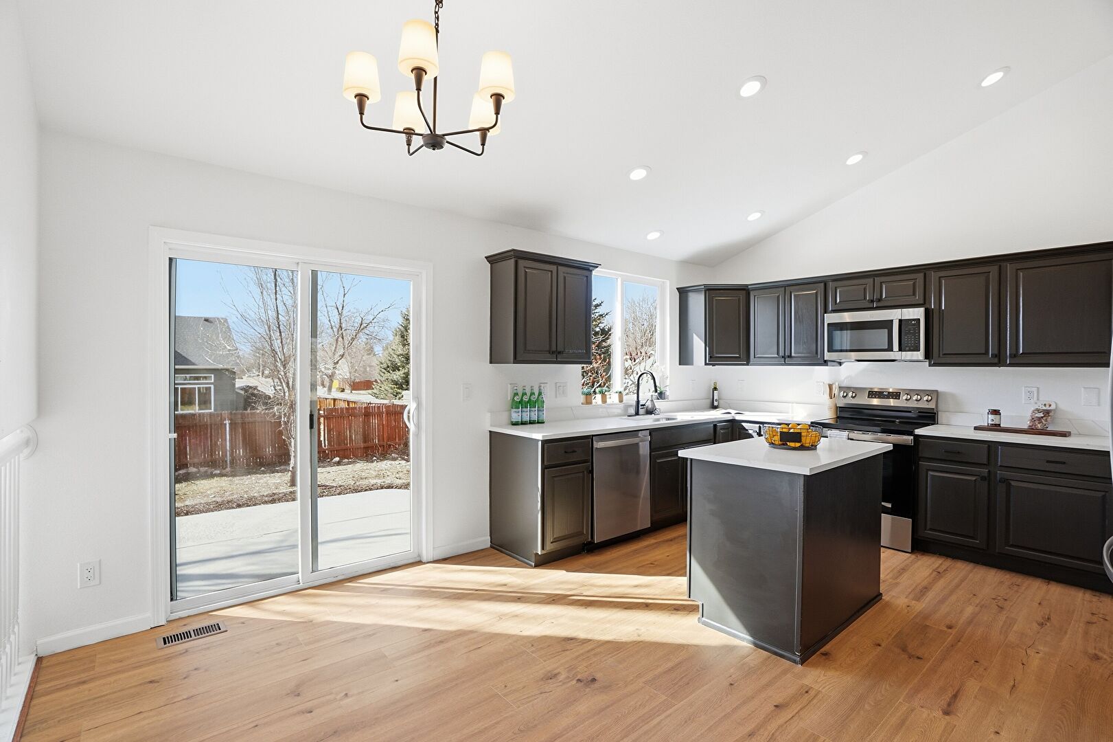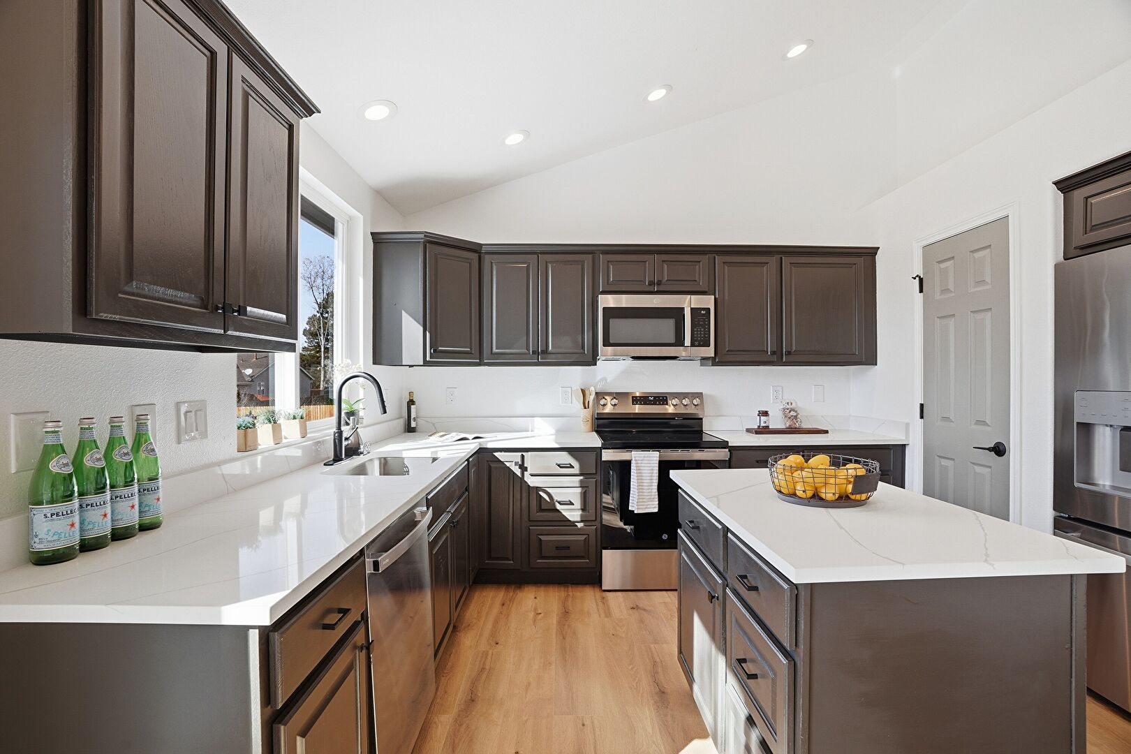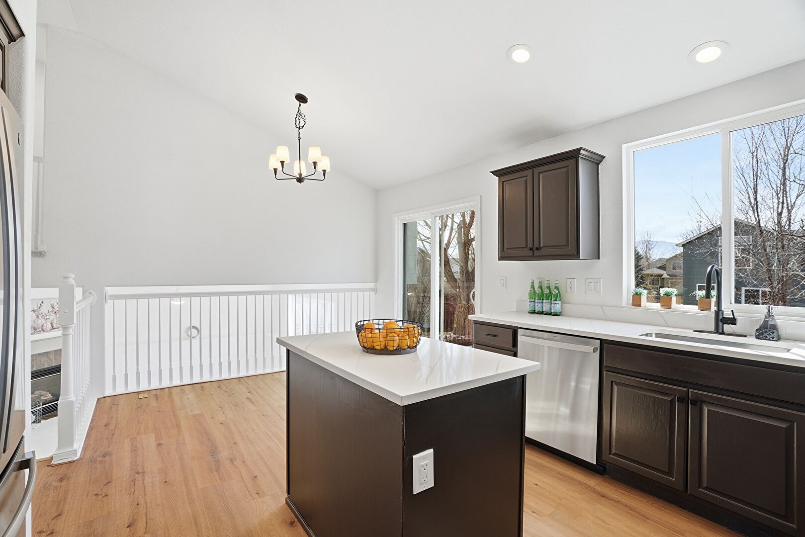 Baseboards Wall, Crown Molding Cabinets, Dark Brown Cabinets, Drywall, High Ceiling, Kitchen Island, Natural Light, Notable Chandelier, Pendant Lighting, Recessed Lighting, Stairs, Stone Countertops, Vaulted Ceiling, Vent, Wood Finish Floor, High Ceiling, Raised Cabinets, Vaulted Ceiling, Wood Finish Floor