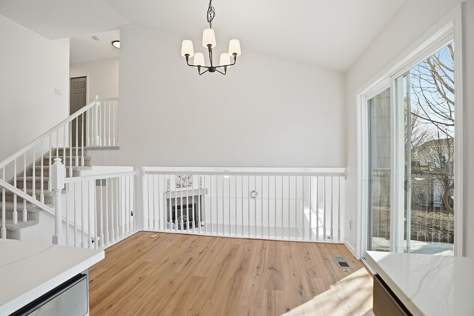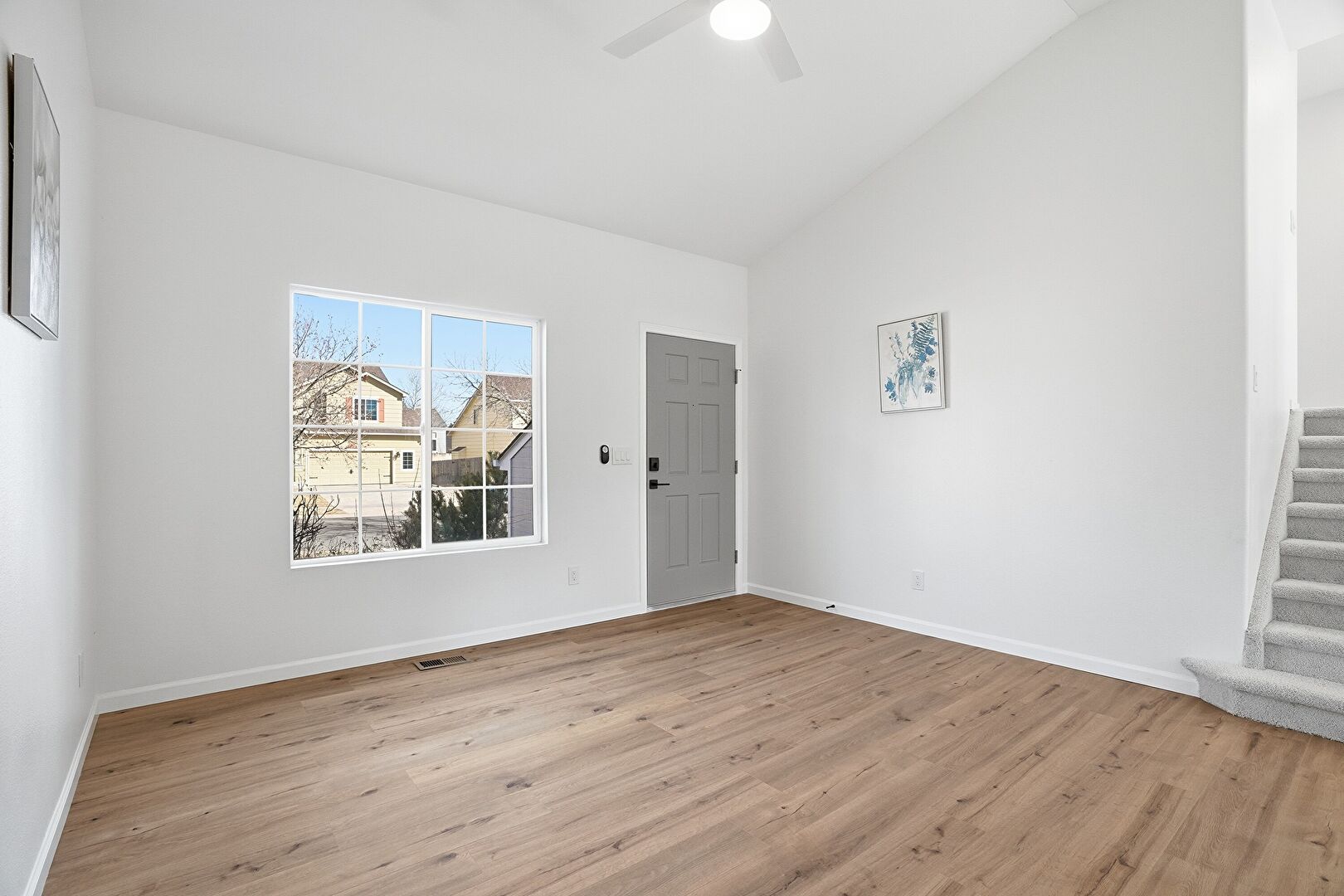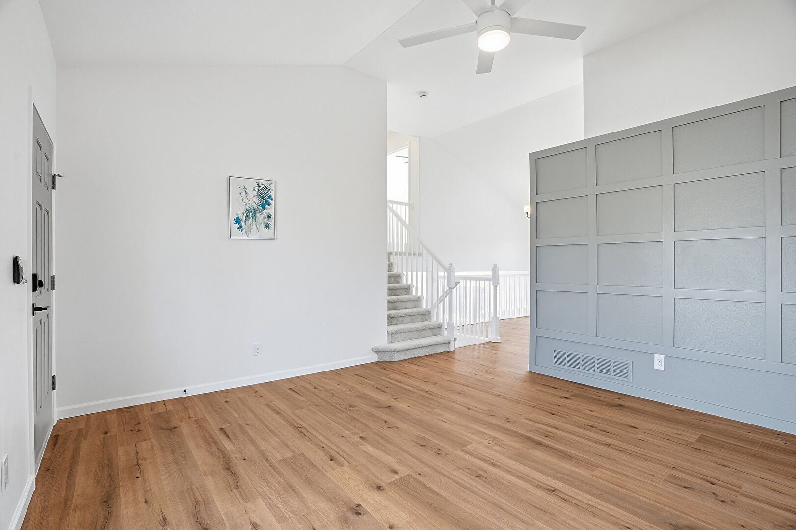 Baseboards Wall, Ceiling Fan, Drywall, High Ceiling, Natural Light, Notable Chandelier, Stairs, Vaulted Ceiling, Vent, Wood Finish Floor, Closet, High Ceiling, Stairs, Vaulted Ceiling