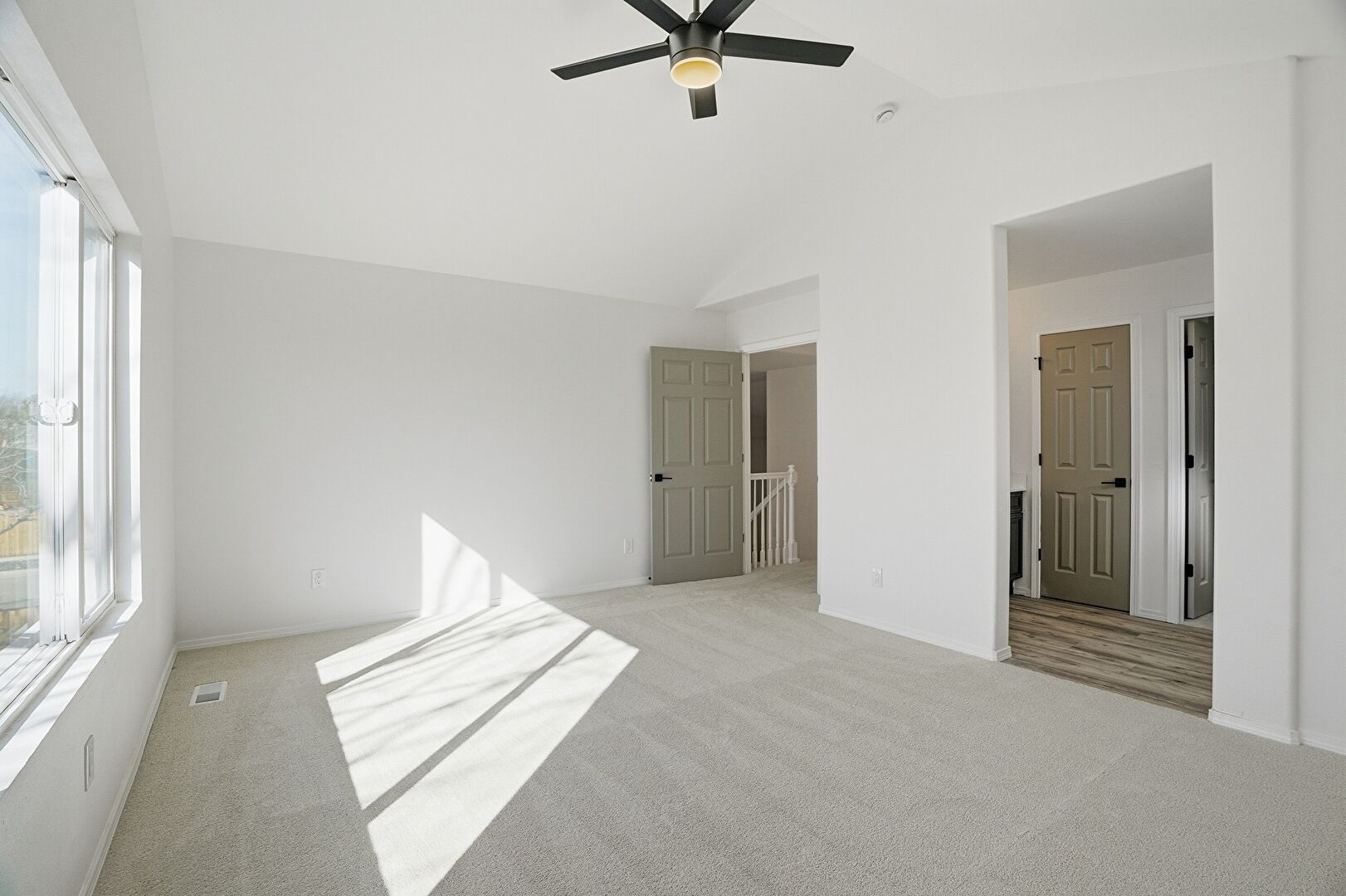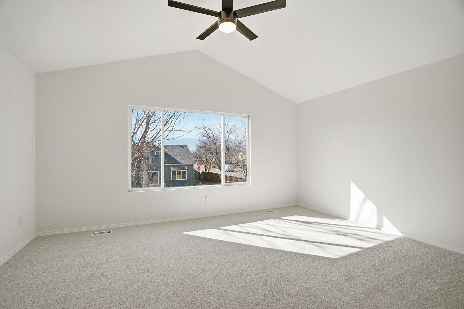 Baseboards Wall, Carpet, Cathedral Ceiling, Ceiling Fan, Drywall, High Ceiling, Natural Light, Vaulted Ceiling, Vent, Baseboards Wall, Drywall, Natural Light, Vaulted Ceiling
