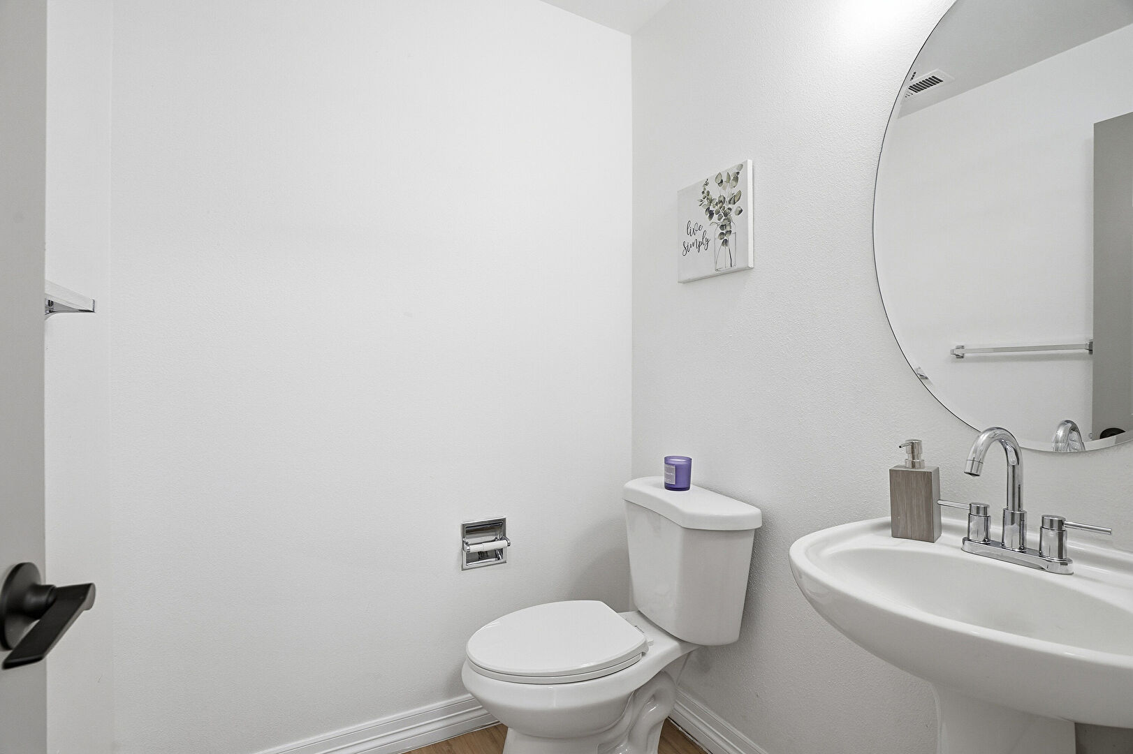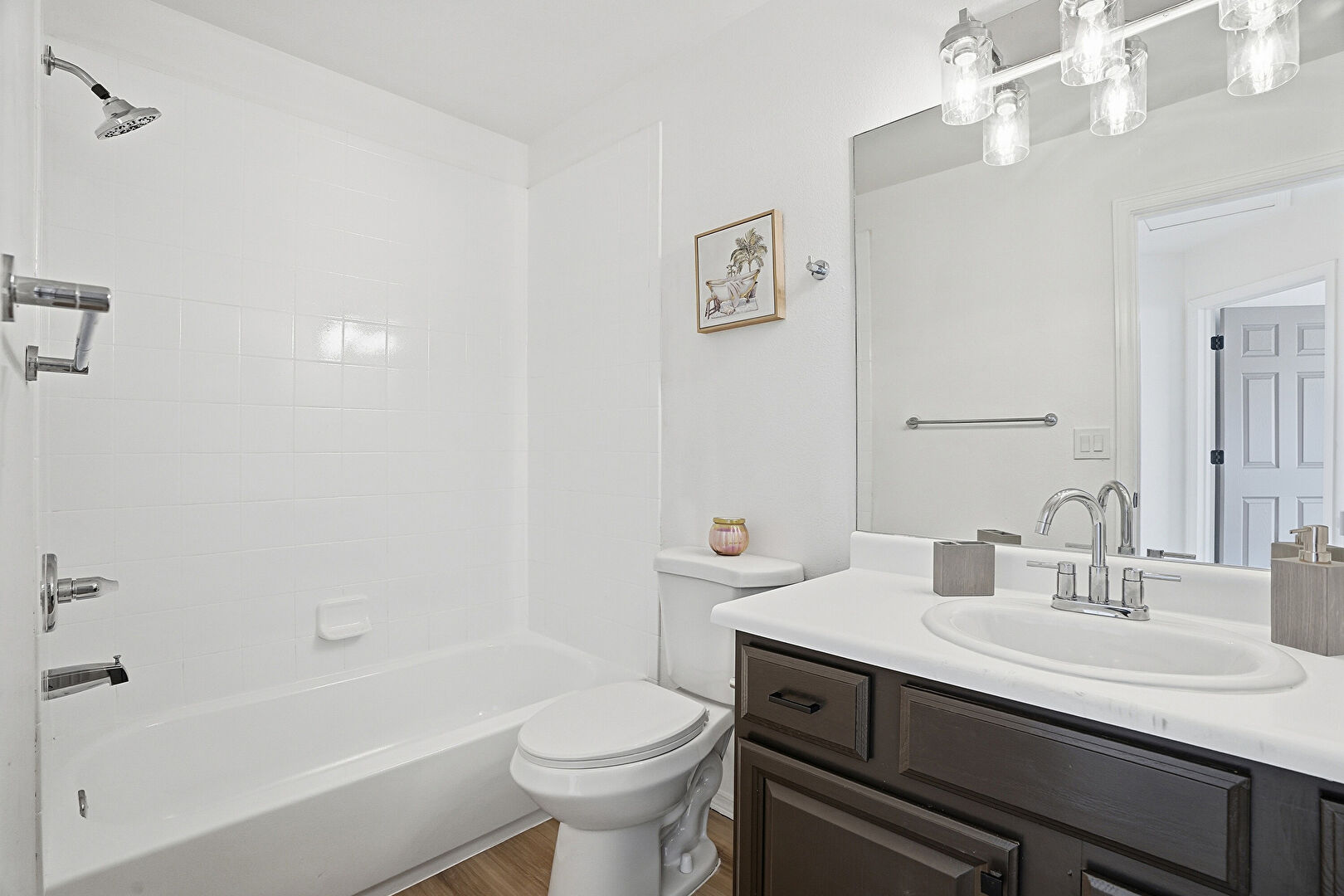 Baseboards Wall, Combined Bath Shower, Drywall, Half Bathroom, Vanity, Vent, Wood Finish Floor, Full Bathroom, Wood Finish Floor
