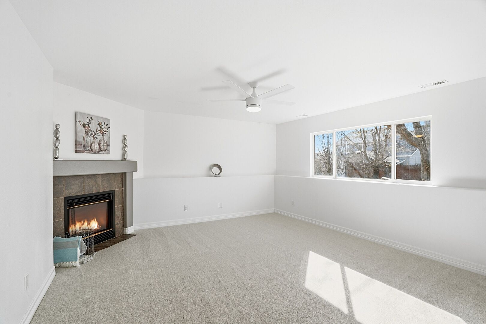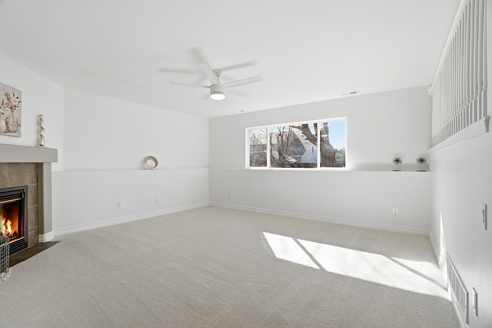 Baseboards Wall, Carpet, Ceiling Fan, Drywall, Fireplace, Natural Light, Stairs, Vent, Baseboards Wall, Drywall, Fireplace, Vent