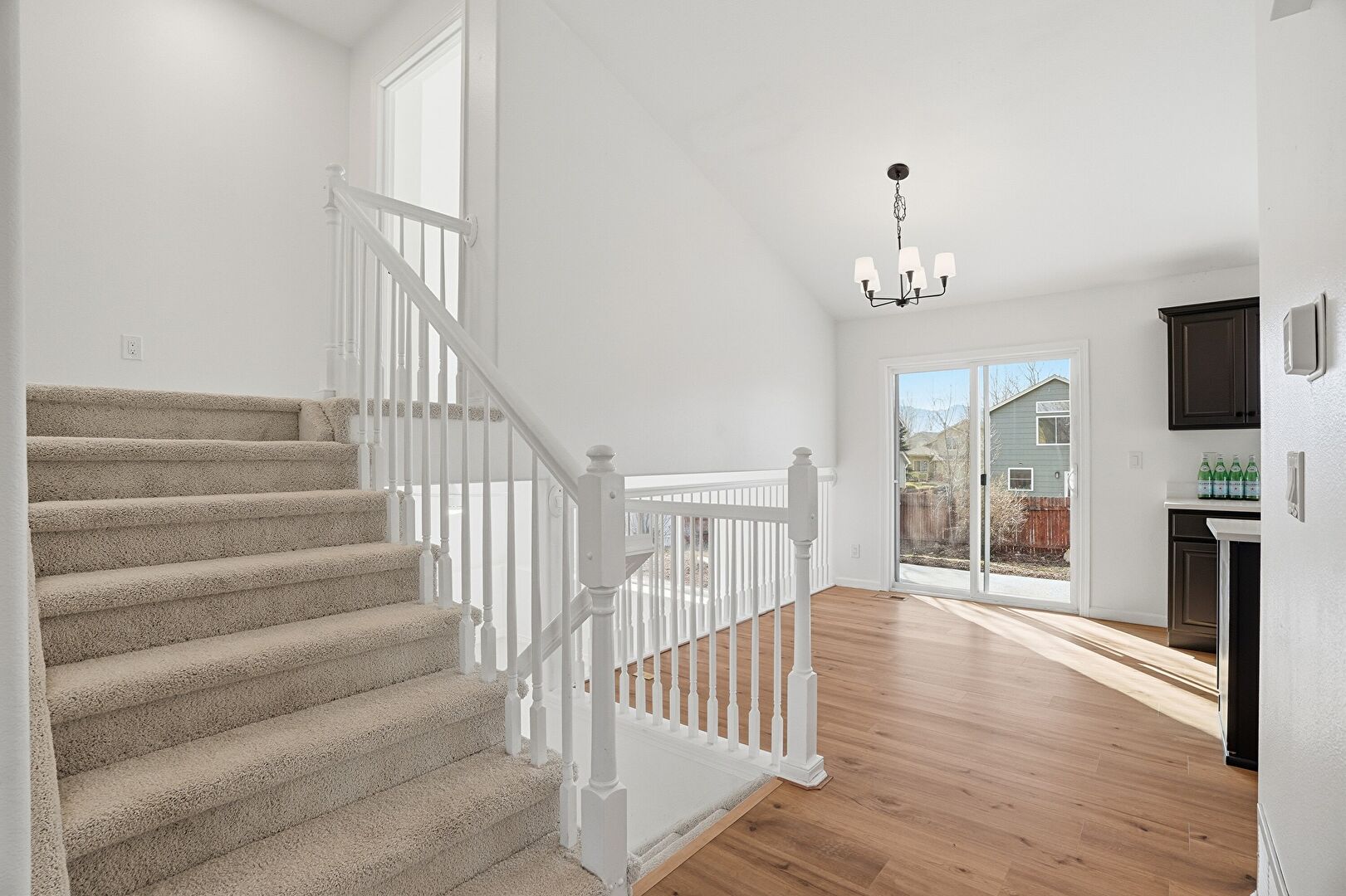 Baseboards Wall, Drywall, High Ceiling, Notable Chandelier, Stairs, Wood Finish Floor, Natural Light