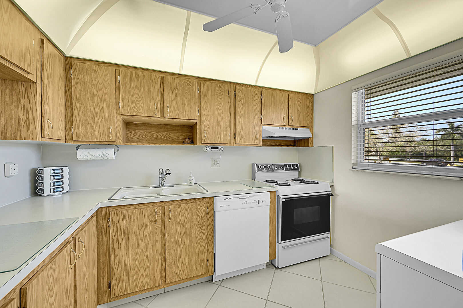 Baseboards Wall, Ceiling Fan, Drywall, Laundry, Medium Brown Cabinets, Natural Light, Open Shelves, Pass Through Window, Tile Floor, Vaulted Ceiling, Vent, Visible Hinge Cabinets, Washer Dryer, Baseboards Wall, Drywall, Vent, Visible Hinge Cabinets