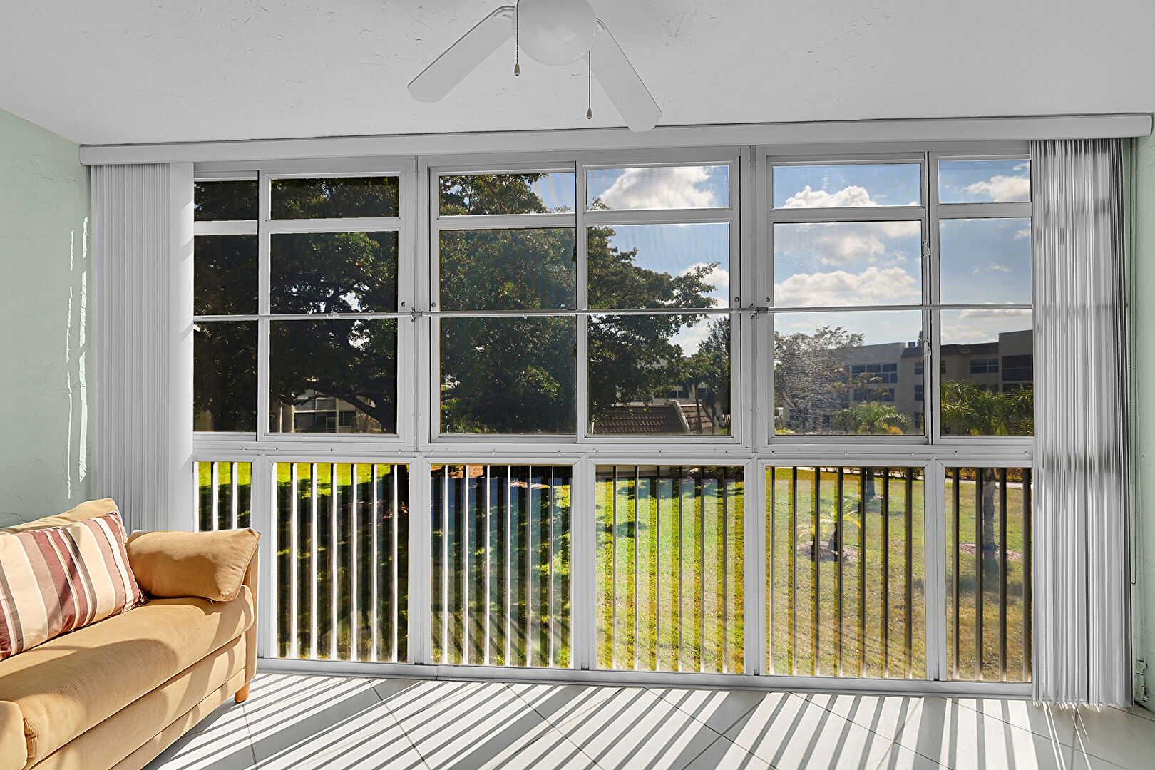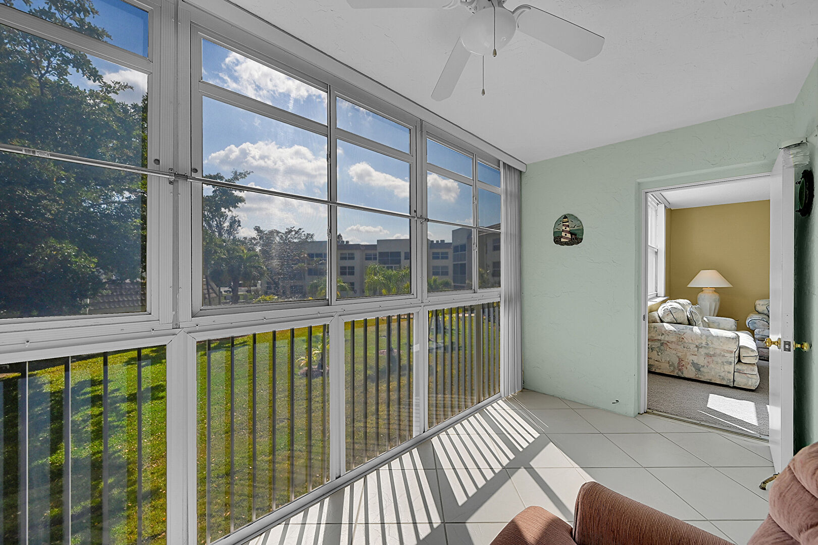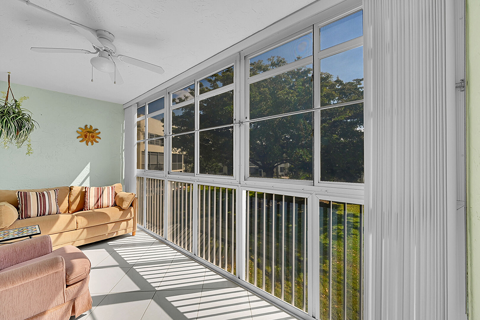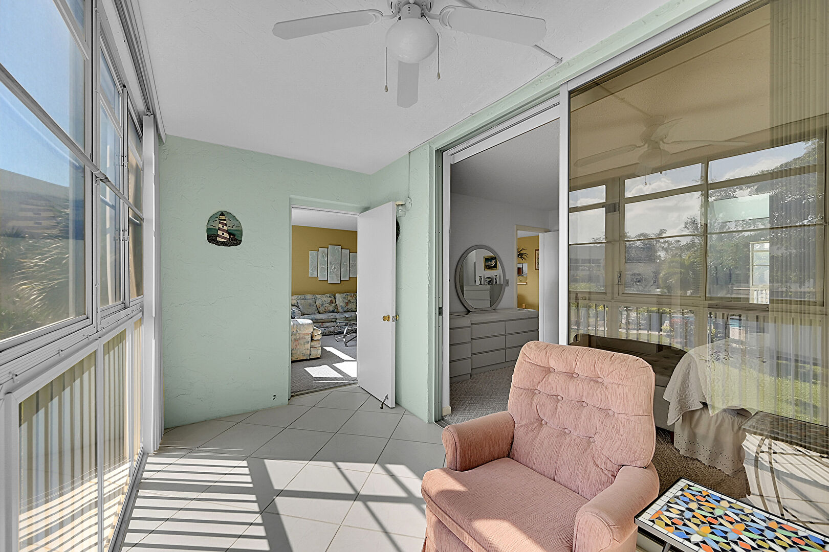 Ceiling Fan, Floor Ceiling Windows, Natural Light, Outdoor Living Space, Sunroom, Tile Floor, Drywall, Natural Light, Sunroom