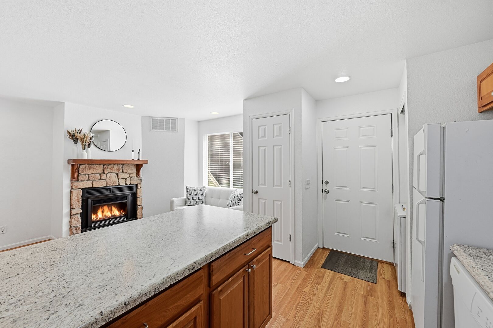 Baseboards Wall, Drywall, Fireplace, Kitchen Bar, Kitchen Peninsula, Laundry, Medium Brown Cabinets, Natural Light, Opens To Living Area, Raised Cabinets, Recessed Lighting, Stone Countertops, Textured Ceiling, U Shaped Kitchen, Vent, Wood Finish Floor, Baseboards Wall, Kitchen Peninsula, Opens To Living Area, Wood Finish Floor