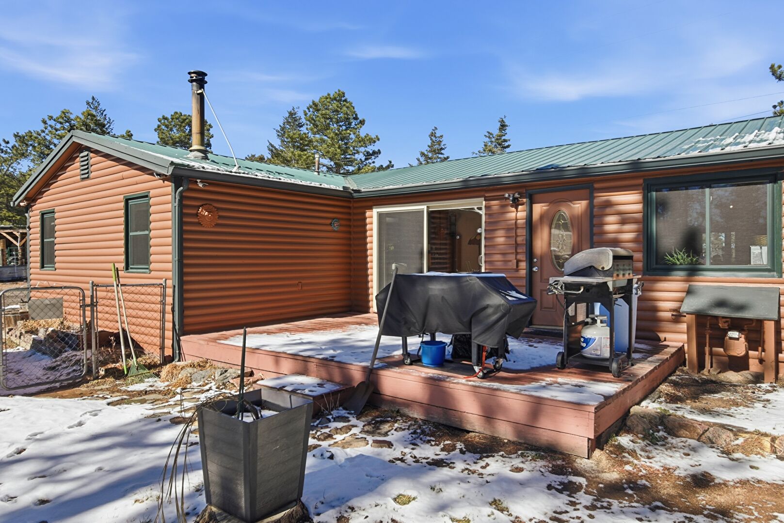 Deck, Downspout, Fence, Fountain, Grill, Gutters, Horizontal Siding, Log Veneer Siding, Metal Roof, Patio, Corrugated Roof, Horizontal Siding