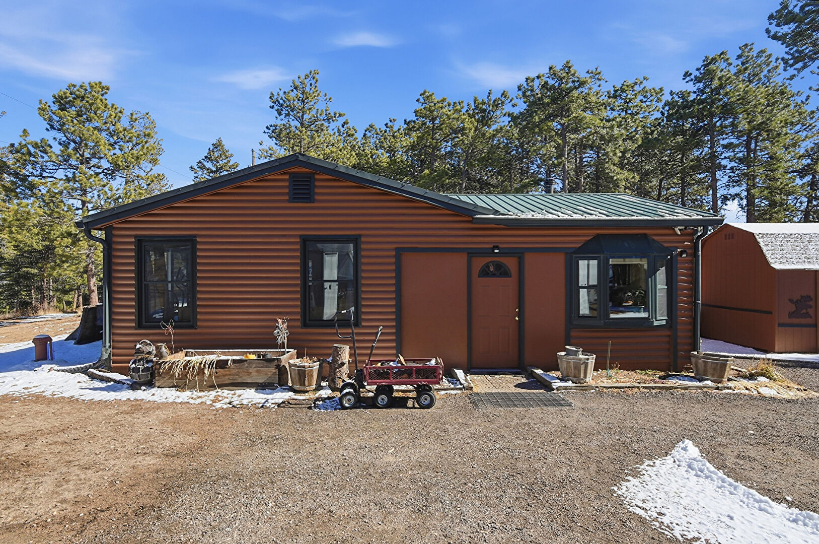 Downspout, Gutters, Horizontal Siding, Log Veneer Siding, Metal Roof, Outdoor Structure, Parking Pad, Shed, Standing Seam Roof, Gutters, Log Veneer Siding
