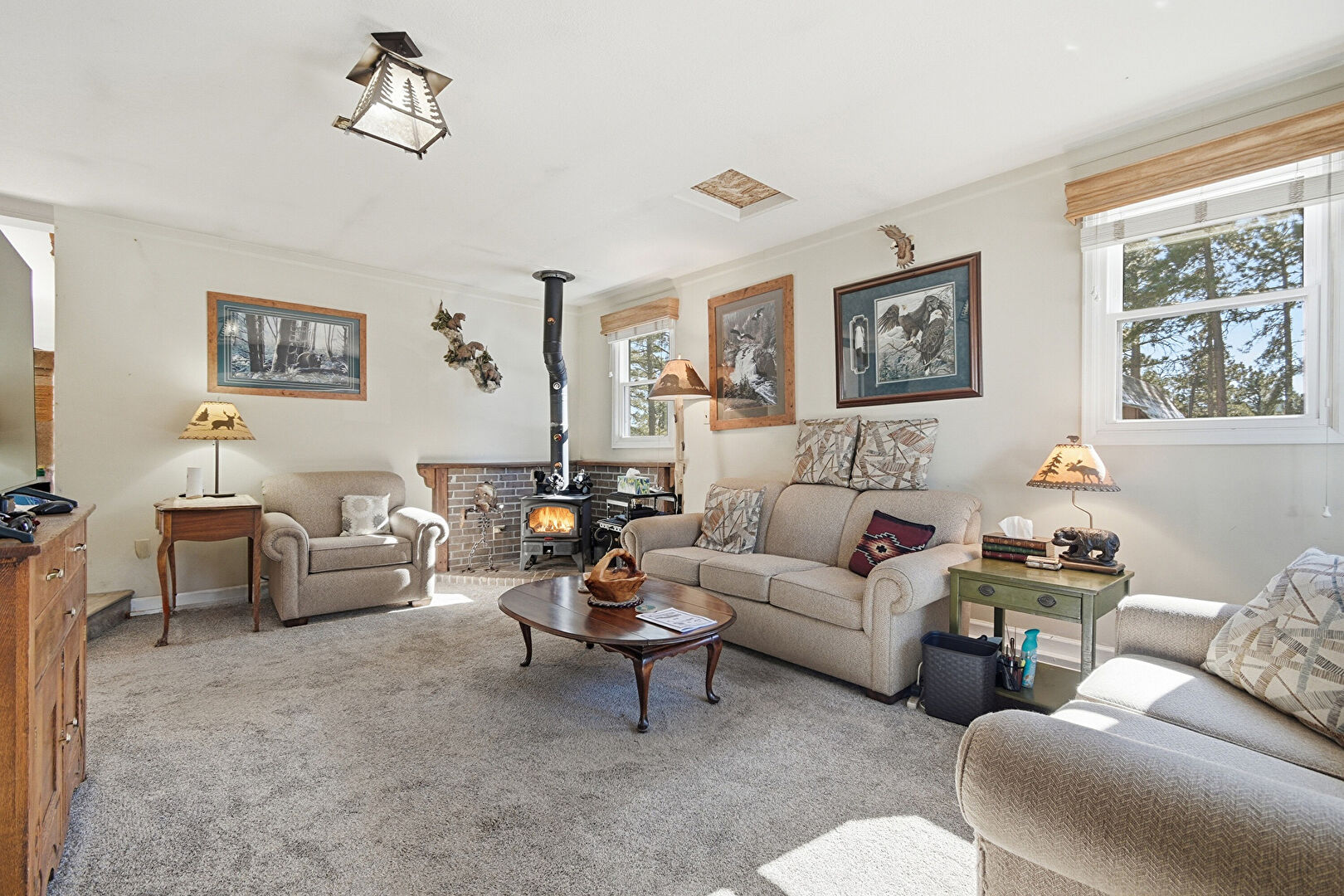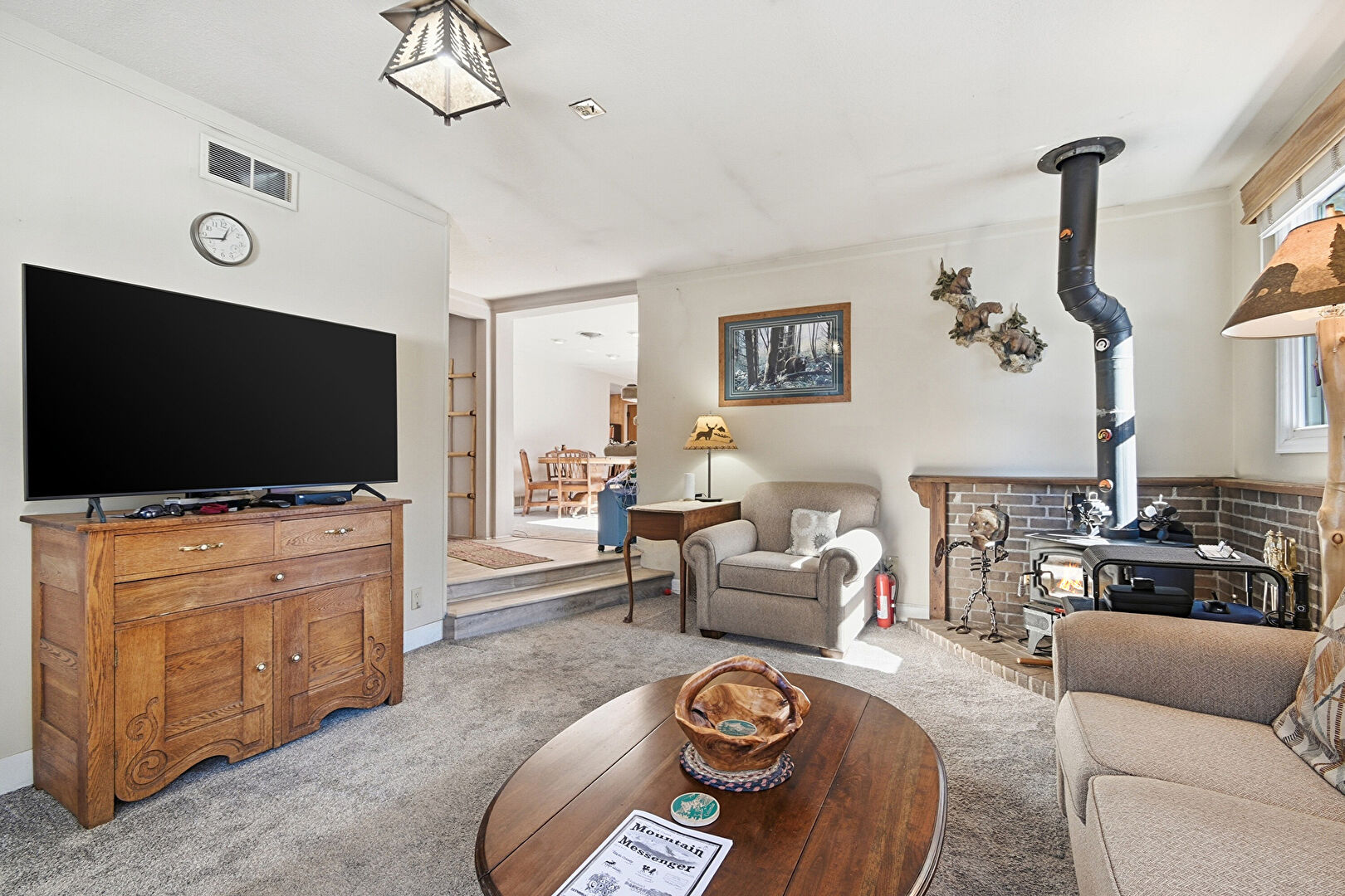 Baseboards Wall, Carpet, Crown Molding, Drywall, Fire Extinguisher, Natural Light, Vent, Wood Stove, Drywall, Natural Light, Wood Stove