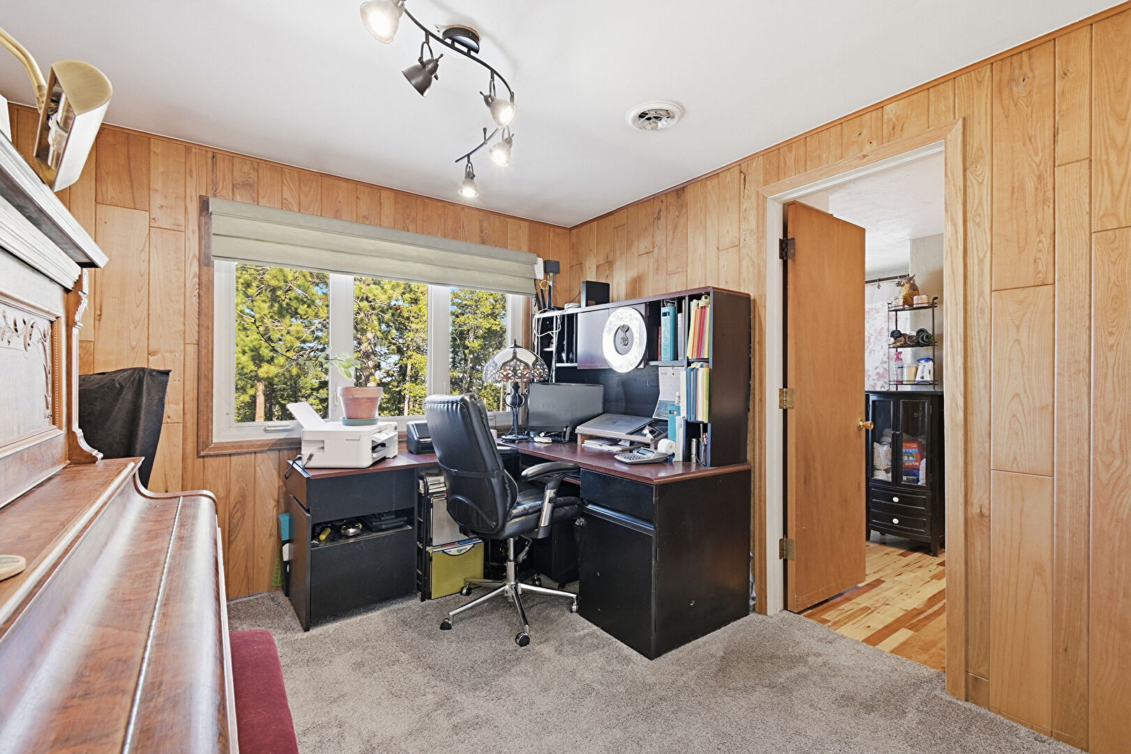 Carpet, Natural Light, Office Area, Track Lighting, Wood Wall, Vent