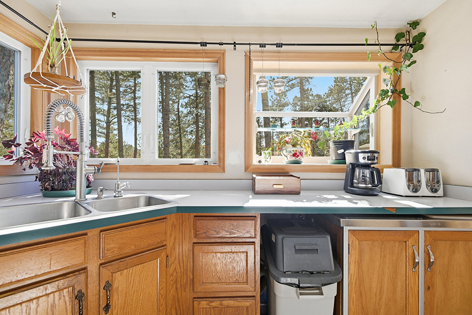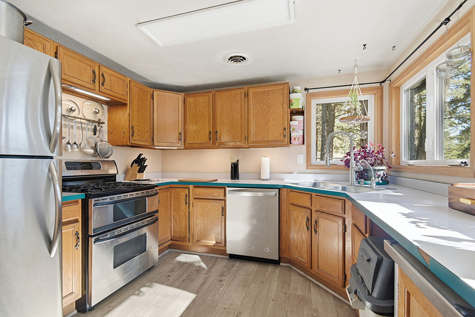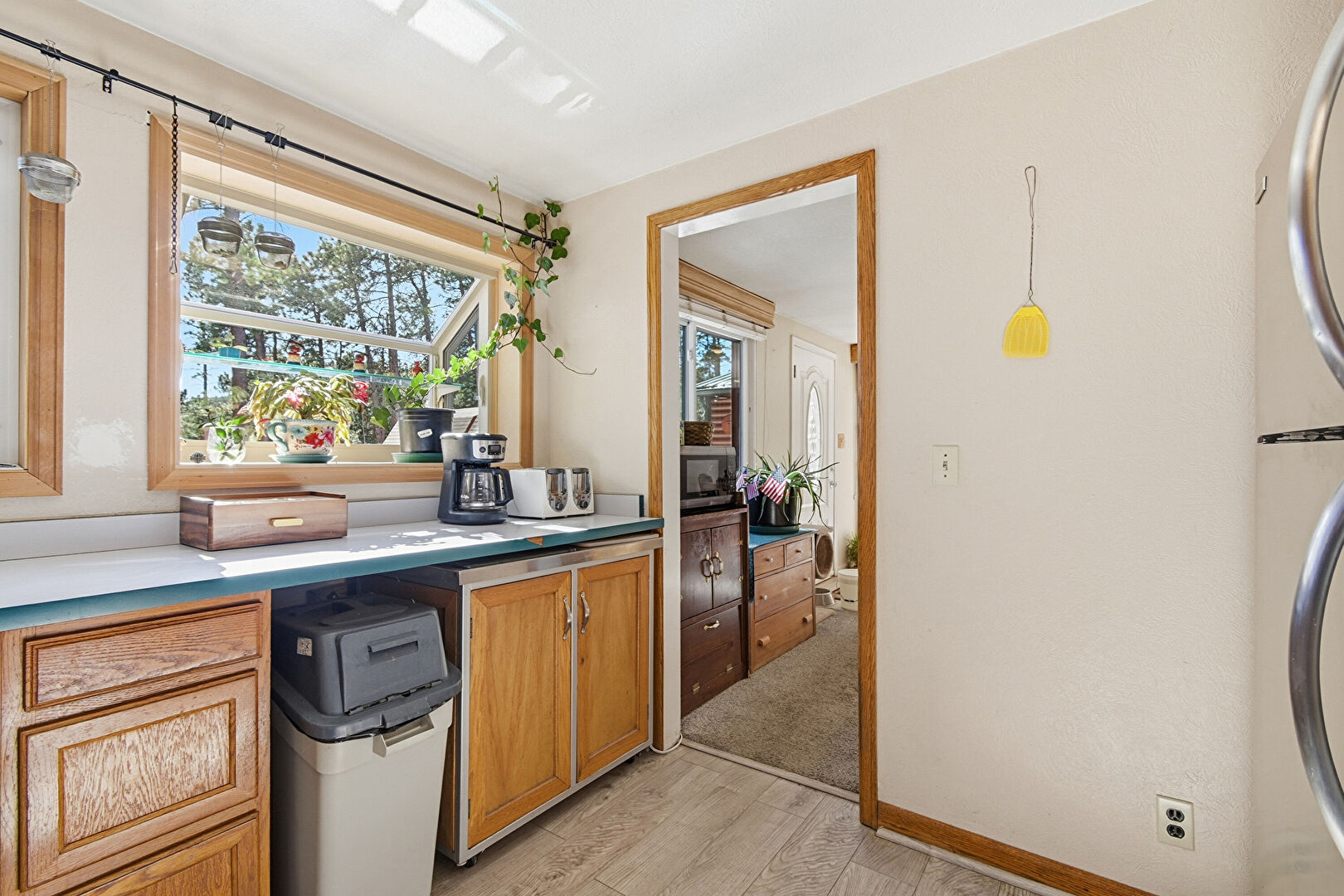 Baseboards Wall, Drywall, Medium Brown Cabinets, Natural Light, Pendant Lighting, Shaker Cabinets, Toaster, Trash Compactor, Vent, Visible Hinge Cabinets, Wood Finish Floor, Laundry, Medium Brown Cabinets, Natural Light