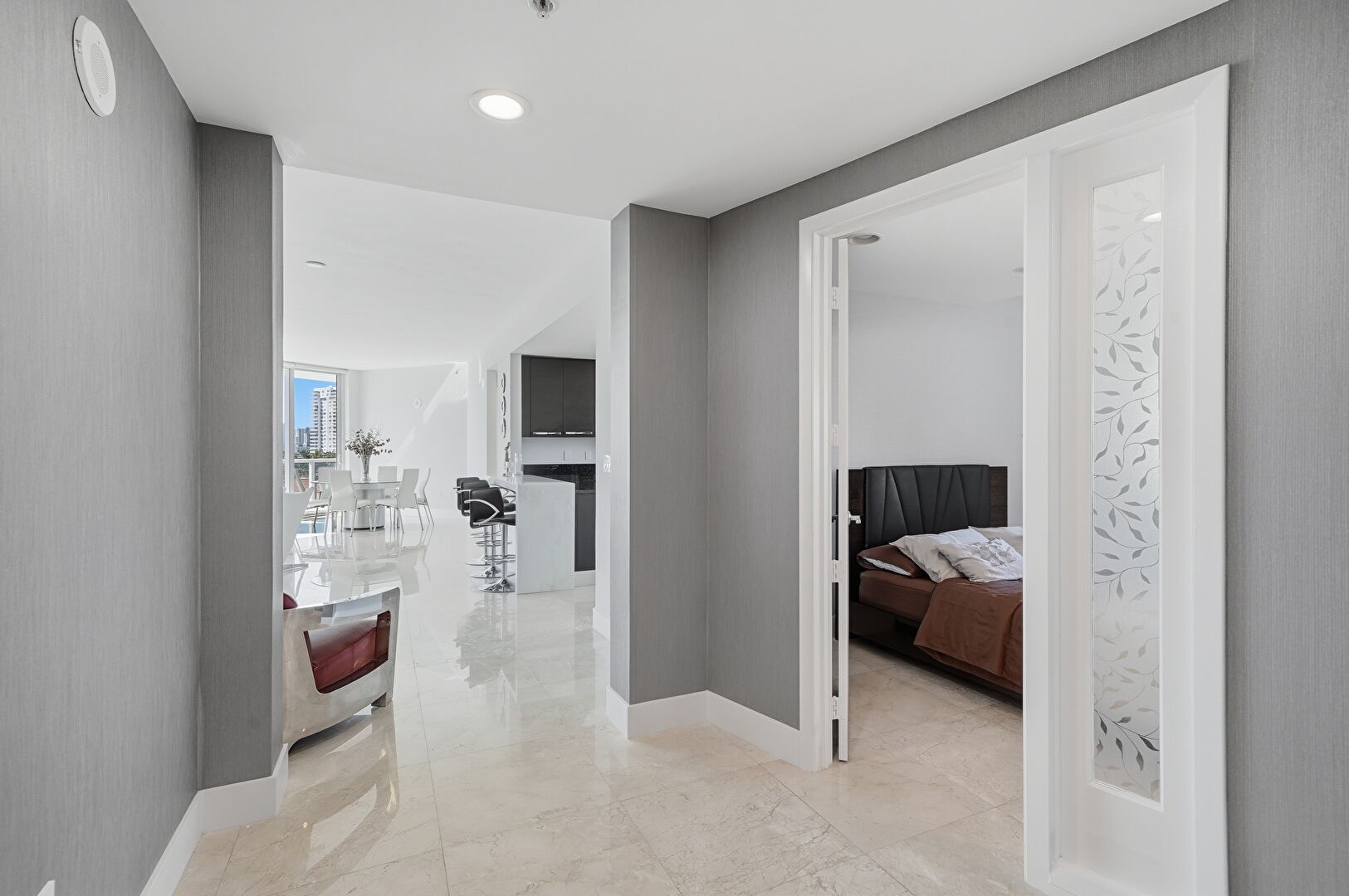Baseboards Wall, Drywall, Natural Light, Recessed Lighting, Smoke Carbon Monoxide Detector, Marble Finish Floor