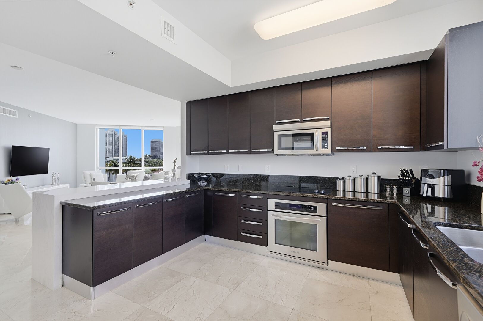 Apartment Complex View, Baseboards Wall, Black Cabinets, Dark Brown Cabinets, Drywall, Flat Panel Cabinets, G Shaped Kitchen, Kitchen Bar, Kitchen Peninsula, L Shaped Kitchen, Natural Light, Opens To Living Area, Stone Countertops, Vent, Black Cabinets, Drywall, Flat Panel Cabinets, Natural Light