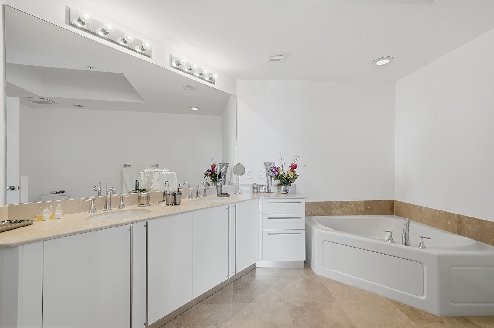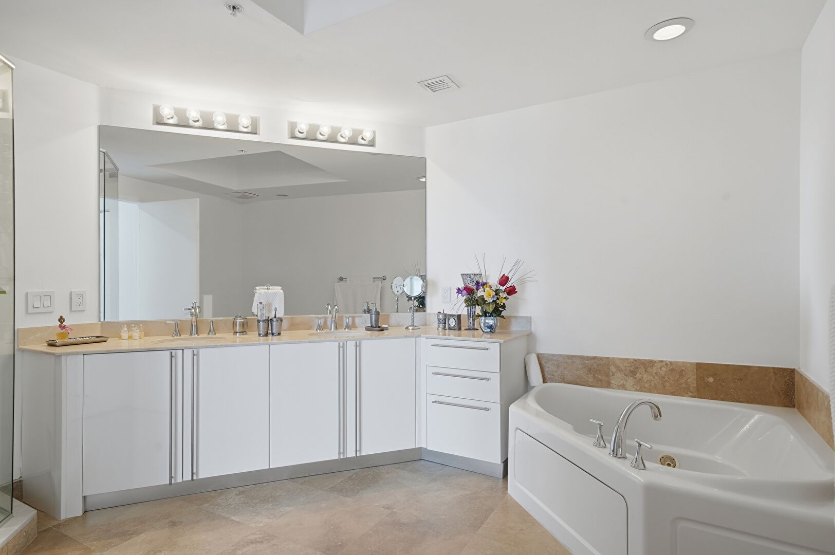 Double Vanity, Drywall, Full Bathroom, Natural Light, Recessed Lighting, Tile Floor, Vanity, Vent, Baseboards Wall, Double Vanity, Full Bathroom