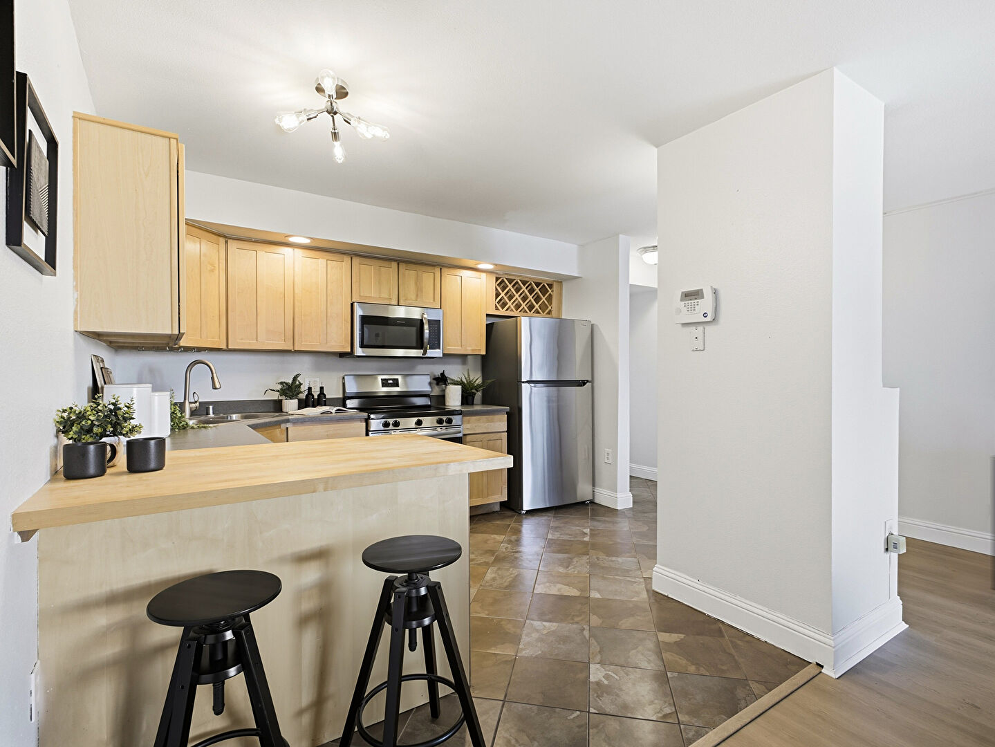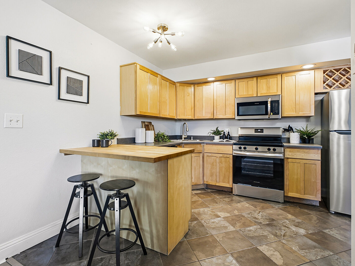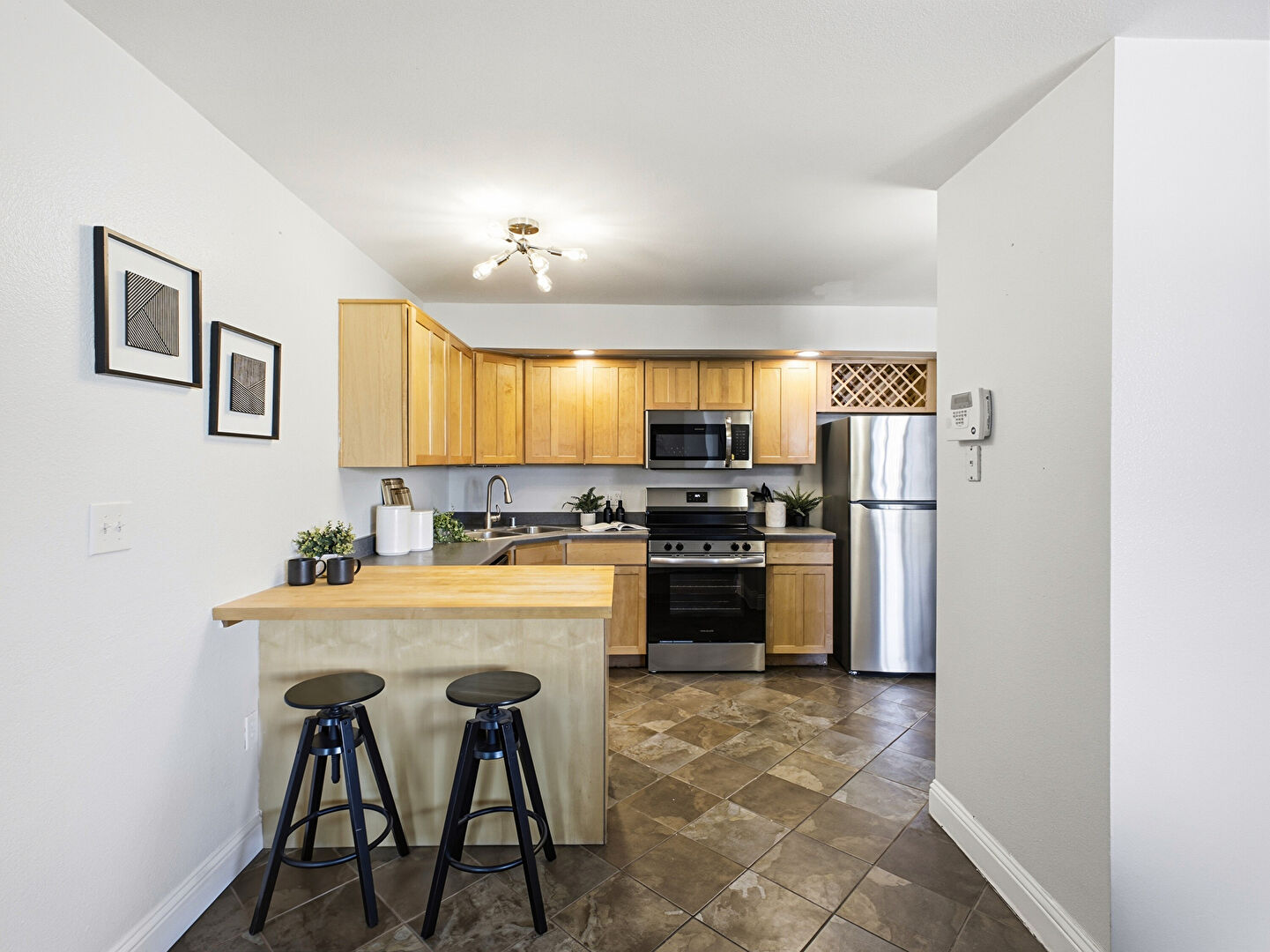 Baseboards Wall, Butcher Block Countertops, Dark Brown Cabinets, Drop Ceiling, Drywall, Kitchen Bar, Kitchen Peninsula, Recessed Lighting, Shaker Cabinets, Stone Countertops, Stone Finish Floor, Tile Floor, U Shaped Kitchen, Vent, Vinyl Floor, Kitchen Bar, Kitchen Peninsula, Pendant Lighting, Recessed Lighting, Shaker Cabinets, Stone Finish Floor