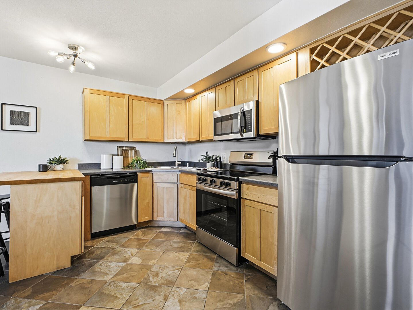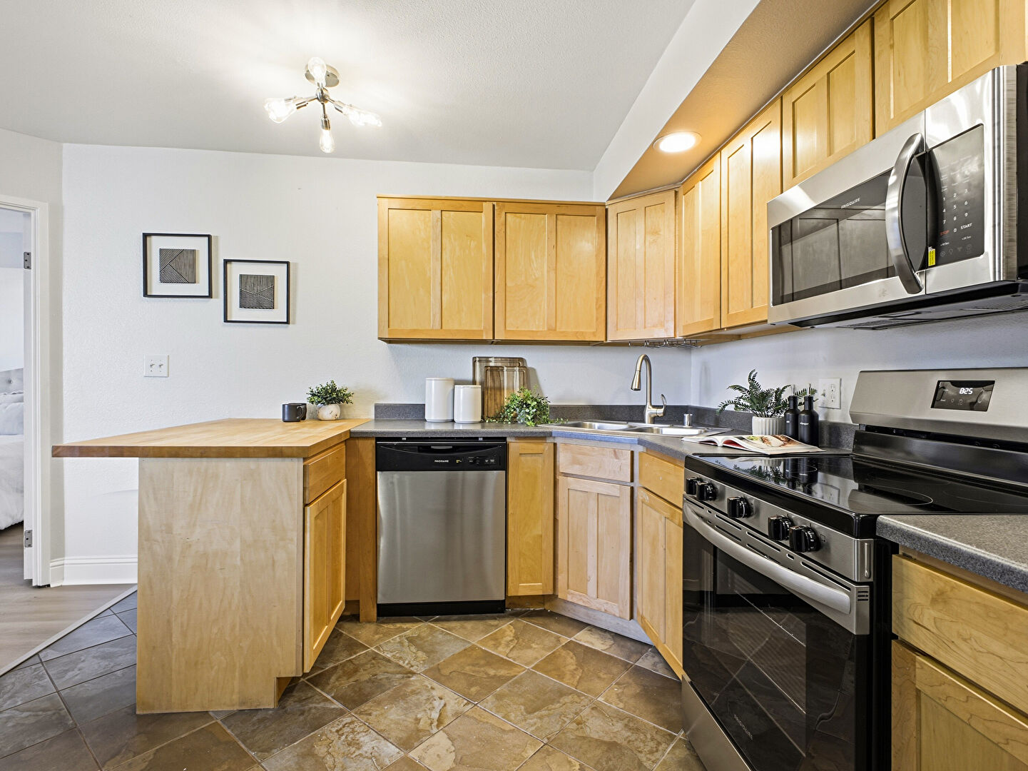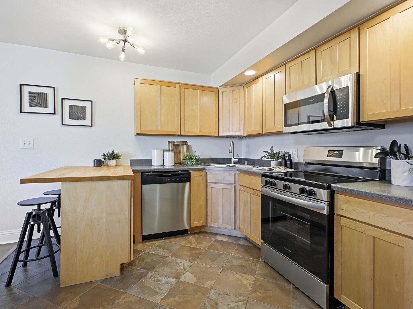 Baseboards Wall, Butcher Block Countertops, Dark Brown Cabinets, Drop Ceiling, Drywall, Kitchen Bar, Kitchen Peninsula, Recessed Lighting, Shaker Cabinets, Stone Countertops, Stone Finish Floor, Tile Floor, U Shaped Kitchen, Vent, Vinyl Floor, Kitchen Bar, Kitchen Peninsula, Pendant Lighting, Recessed Lighting, Shaker Cabinets, Stone Finish Floor