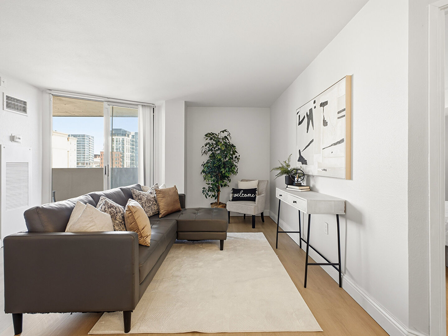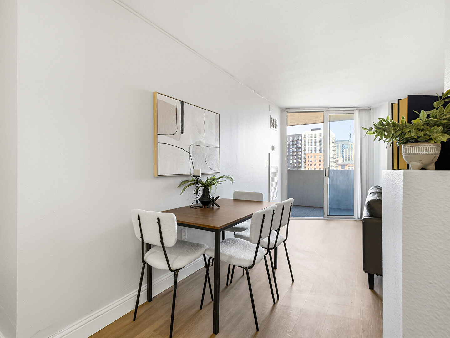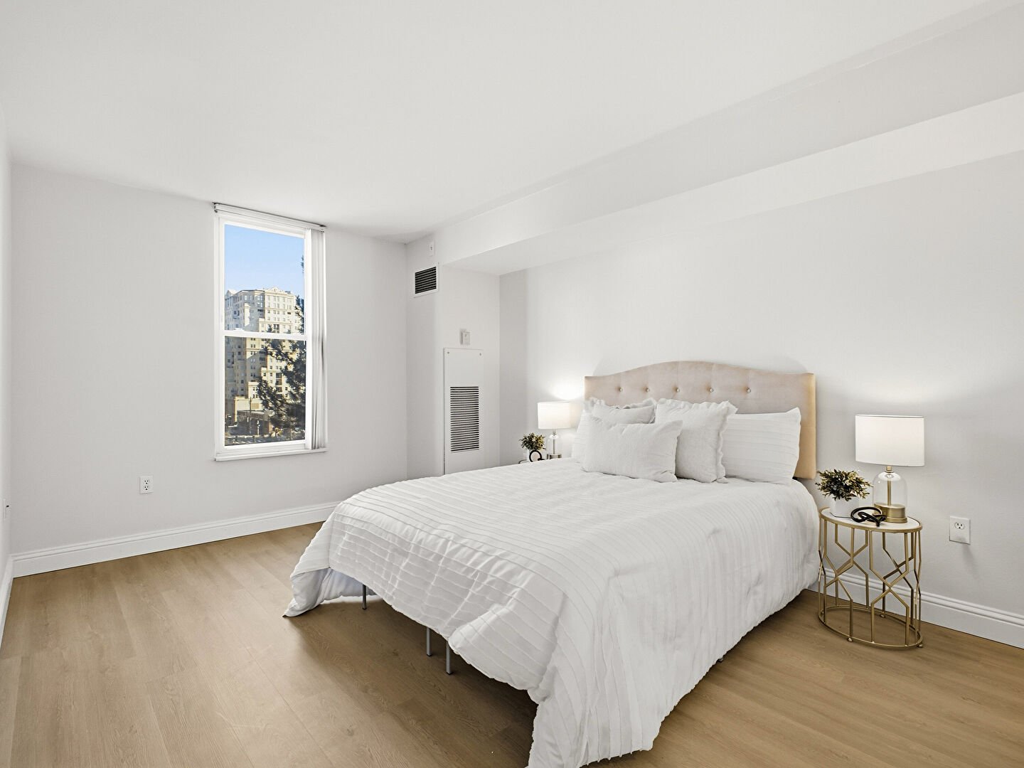 Baseboards Wall, City View, Drywall, Floor Ceiling Windows, Natural Light, Vent, Wall Furnace, Wood Finish Floor, Drywall, Vent