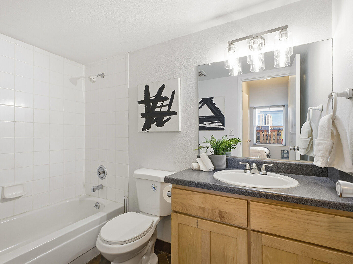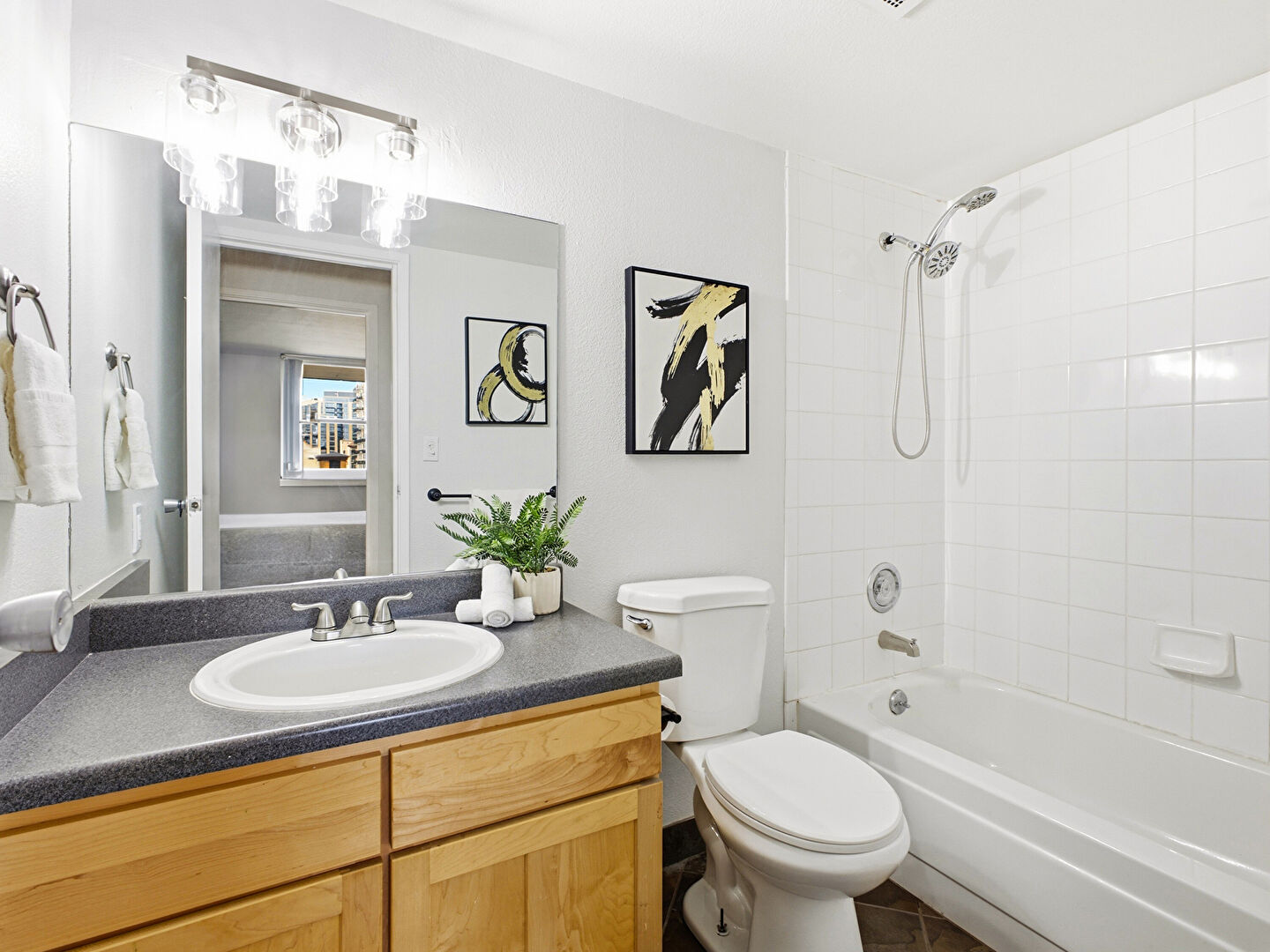 Combined Bath Shower, Drywall, Full Bathroom, Natural Light, Vanity, Drywall, Natural Light