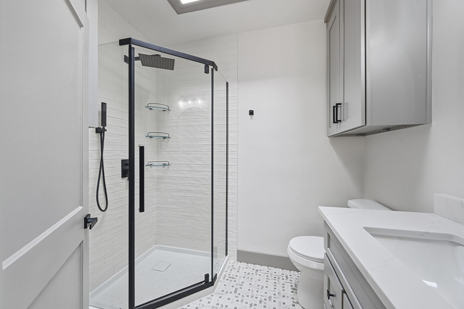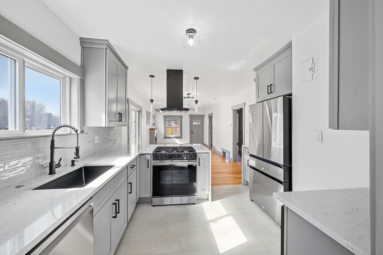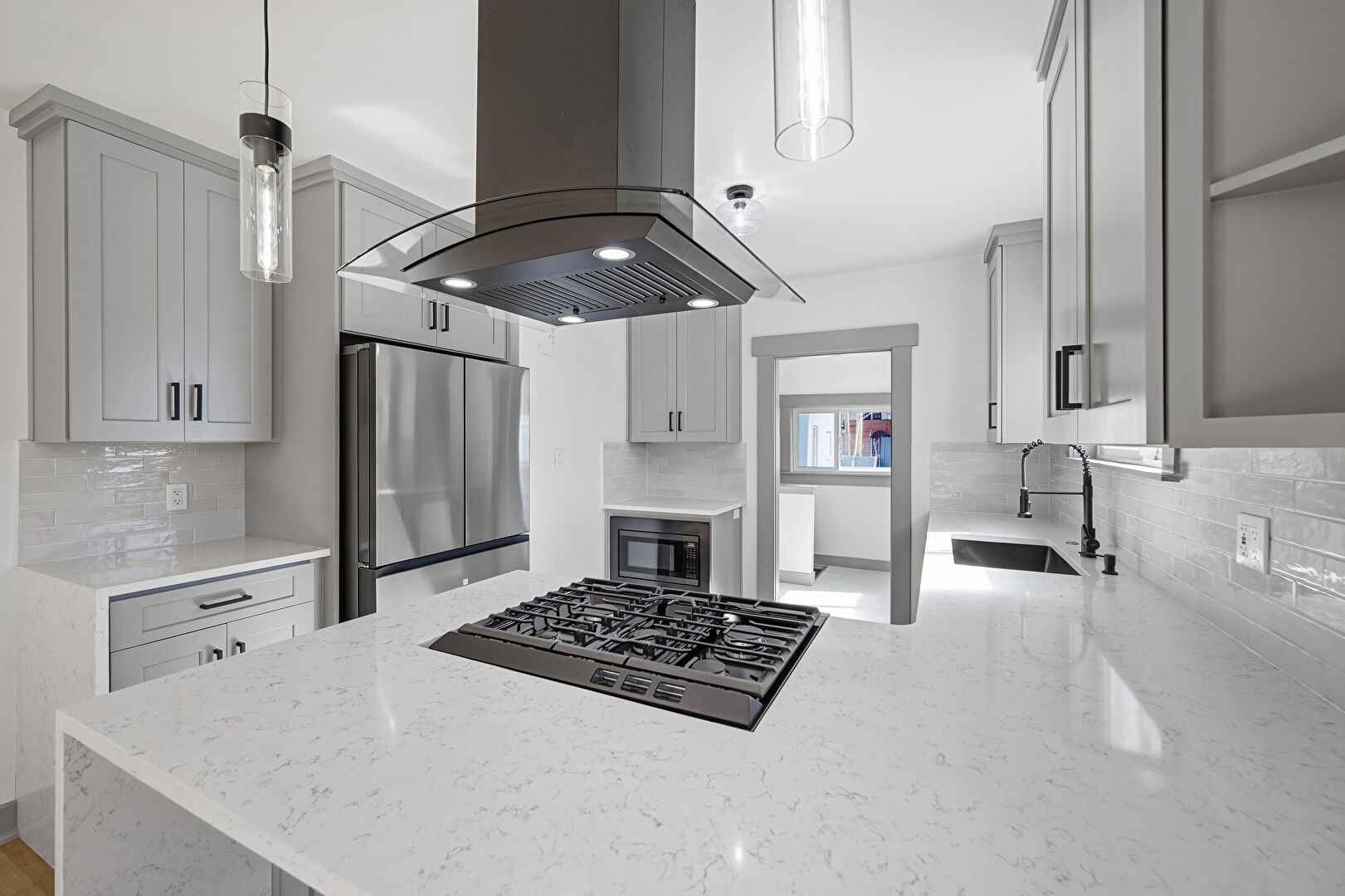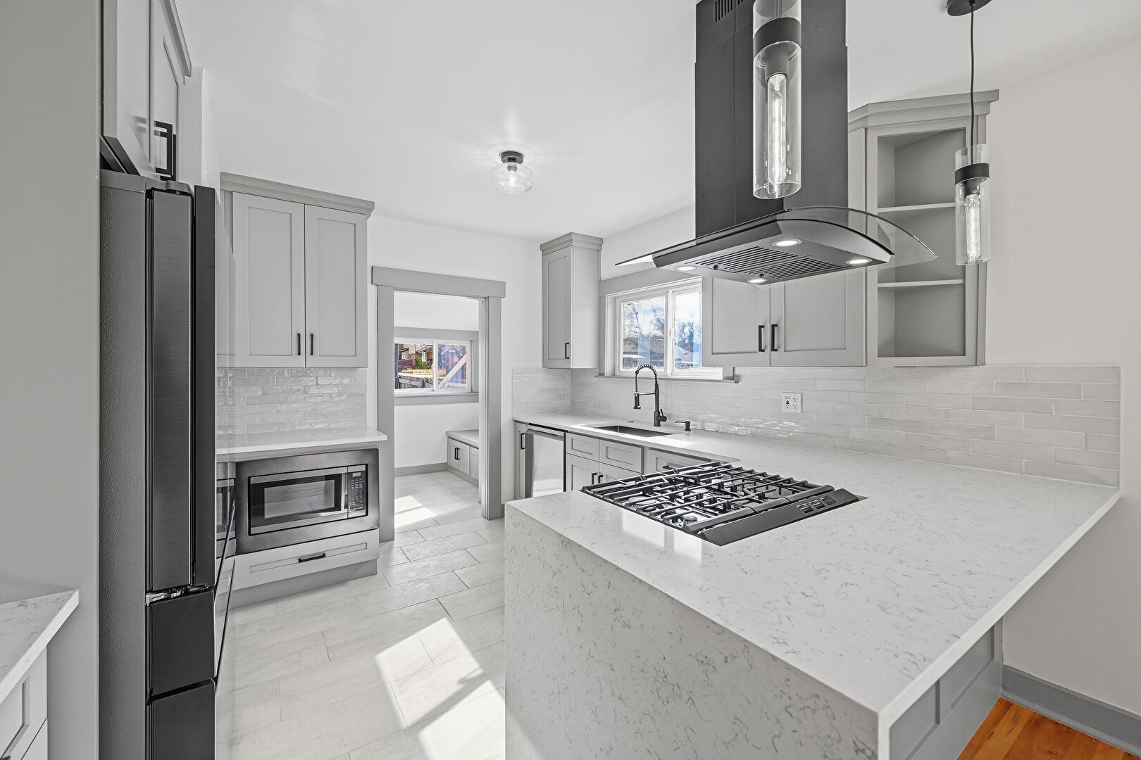 Baseboards Wall, Crown Molding Cabinets, Drywall, G Shaped Kitchen, Gray Cabinets, Kitchen Bar, Kitchen Peninsula, Natural Light, Open Shelves, Opens To Living Area, Pendant Lighting, Shaker Cabinets, Stone Countertops, Tile Floor, Vinyl Floor, Wood Finish Floor, Drywall, Kitchen Peninsula, Natural Light, Pendant Lighting, Shaker Cabinets, Stone Countertops