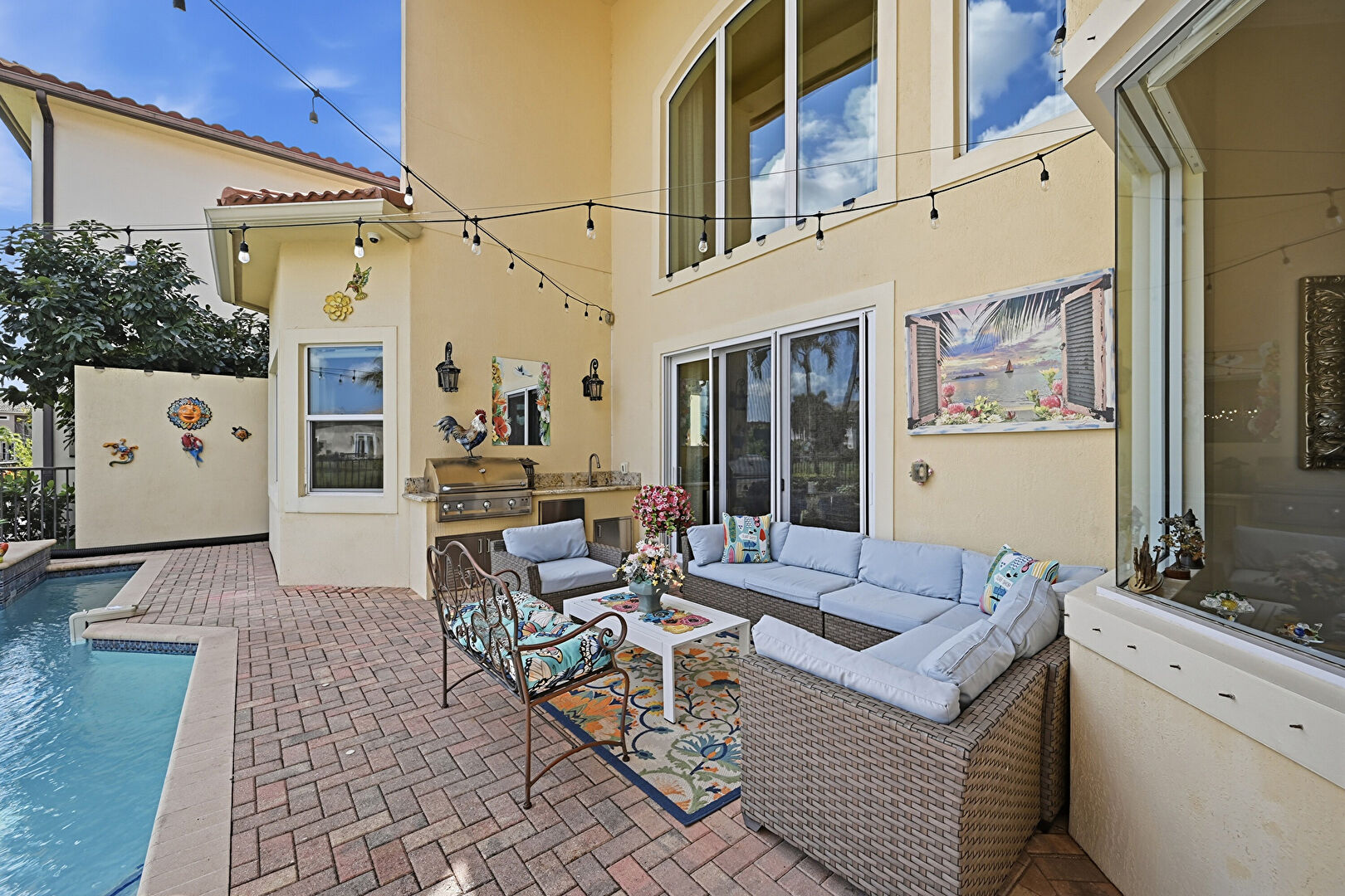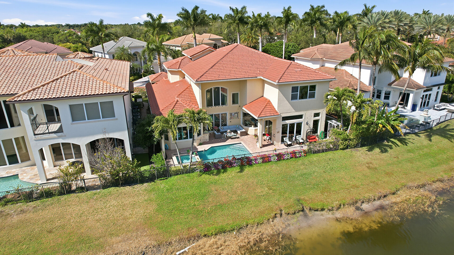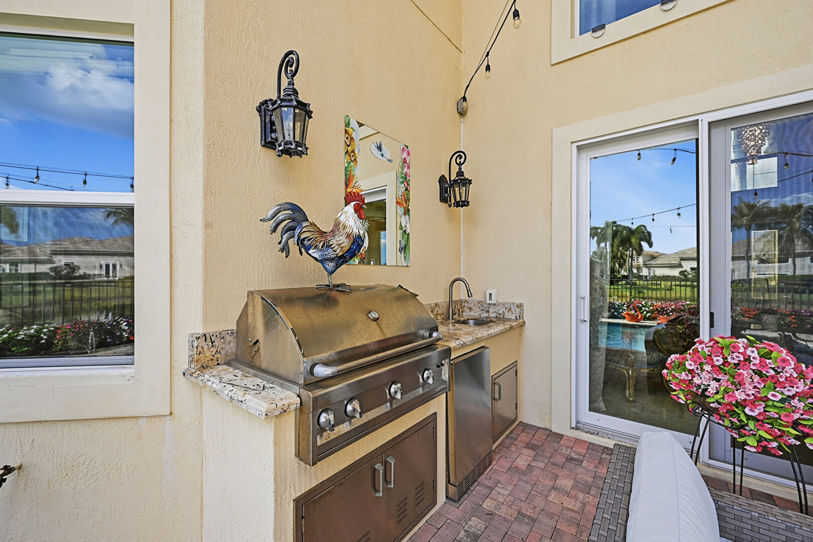Downspout, Fence, Grill, Lawn, Outdoor Living Space, Patio, Pool, Stucco Siding, Tile Roof, Water View, Waterfront, Patio, Pool