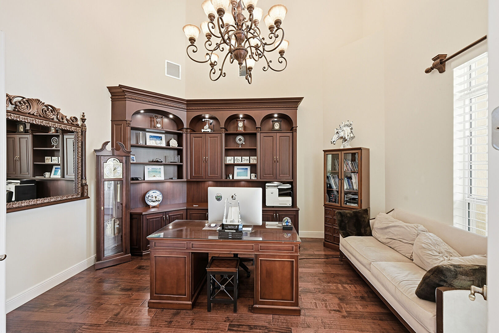 Arched Walkways, Baseboards Wall, Drywall, High Ceiling, Natural Light, Notable Chandelier, Office Area, Vent, Wood Finish Floor, Drywall, High Ceiling